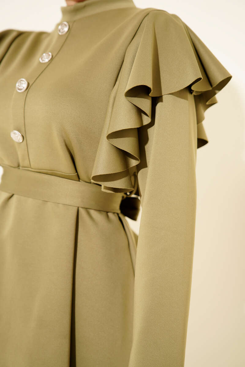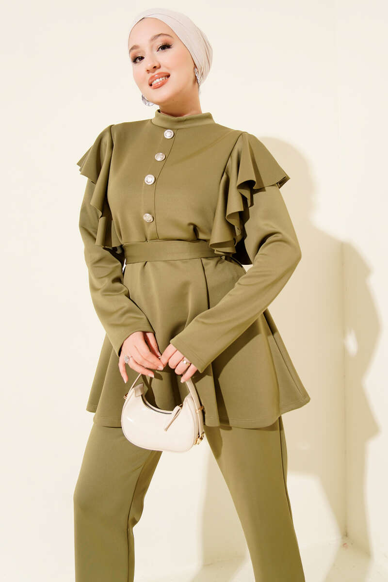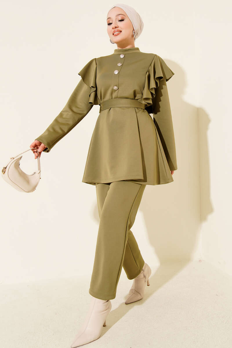 Düğmeli Pelerinli Triko Elbise Takım Vizon