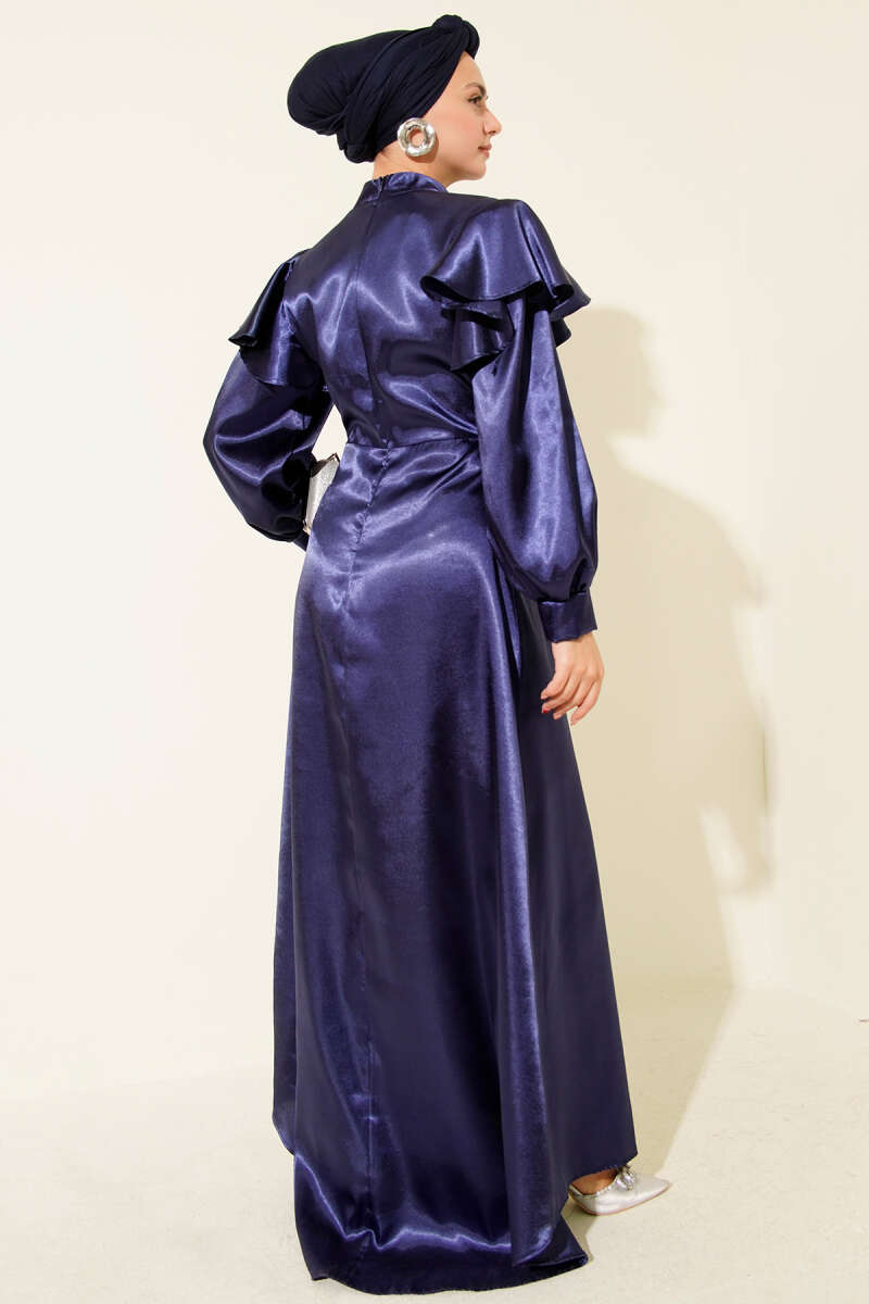 Omuz Fırfırlı Saten Abiye Elbise Lacivert