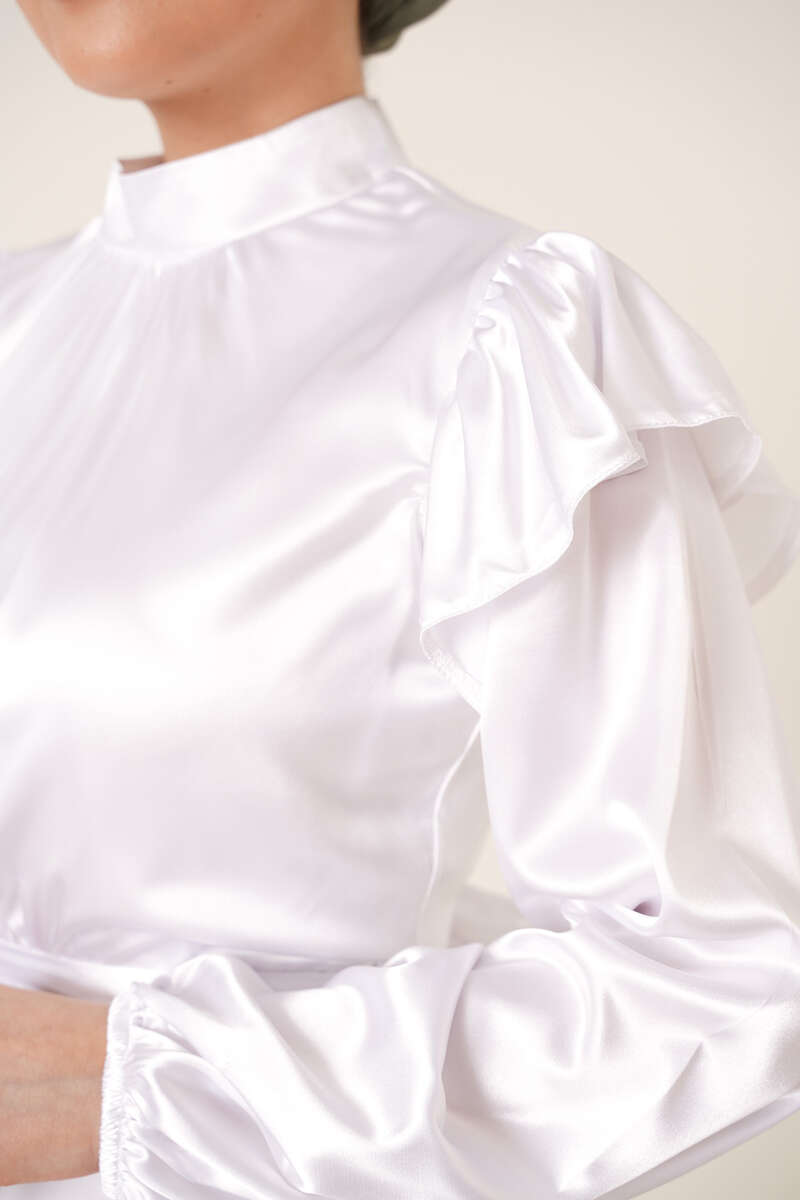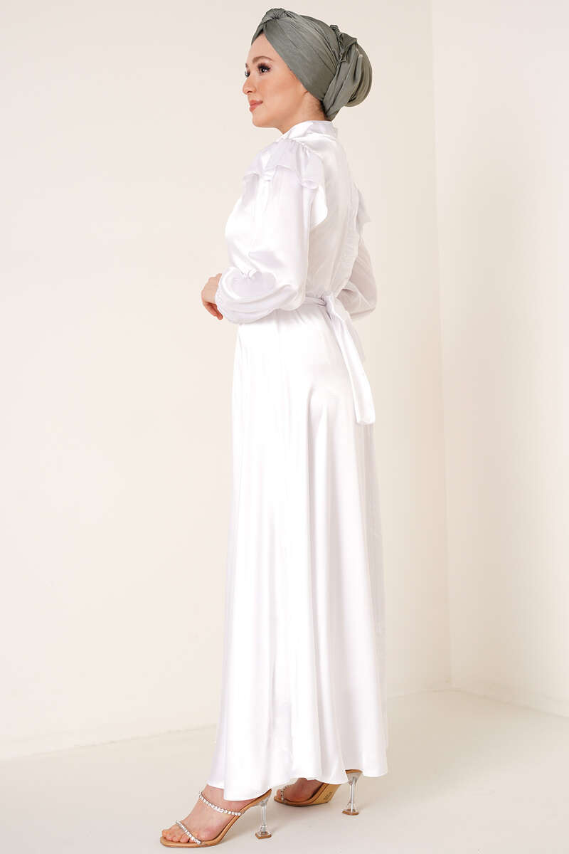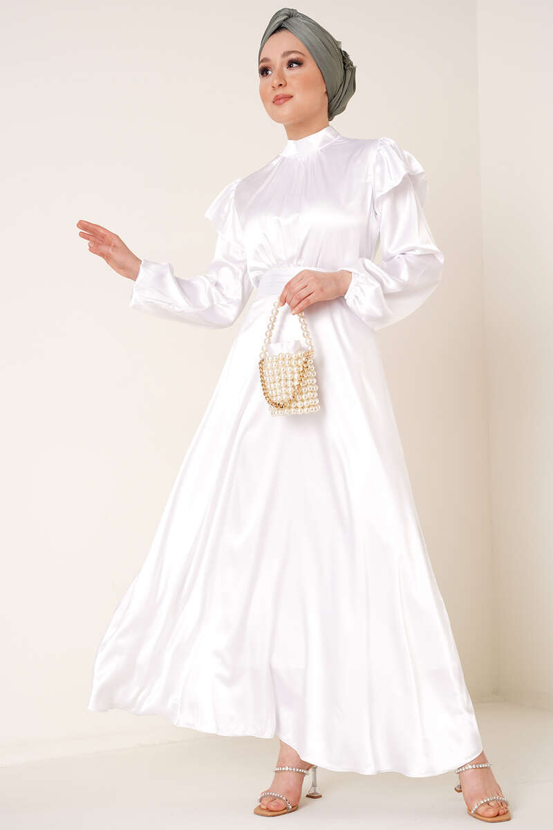 Şıklığınıza imzanızı atacağınız yeni sezon saten elbisemiz omuz fırfırlı modeliyle göz kamaştırmakta. Hakim yaka olan elbisemizin beli kuşaklıdır. Sırt fermuarlı elbisemizin bilekleri lastiklidir. Özel gün ve gecelerinizde size eşlik edecek elbisemizrenk seçenekleriyle sizi beklemekte.