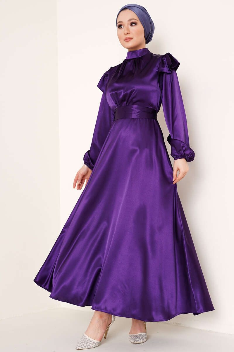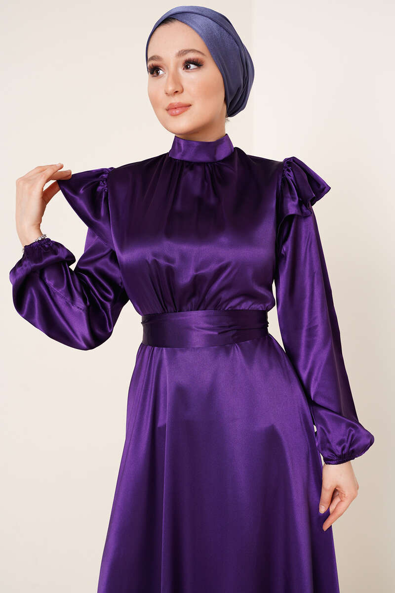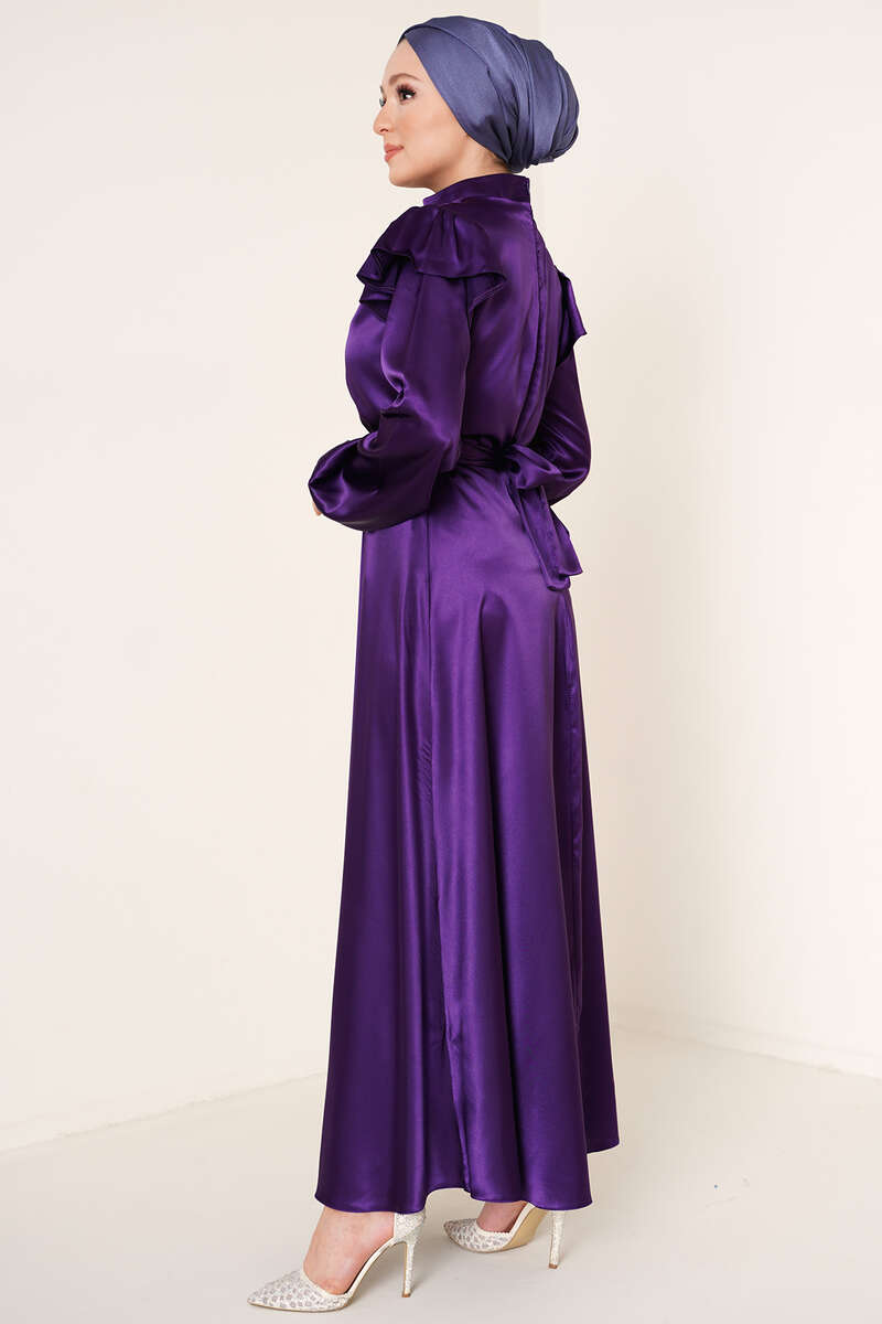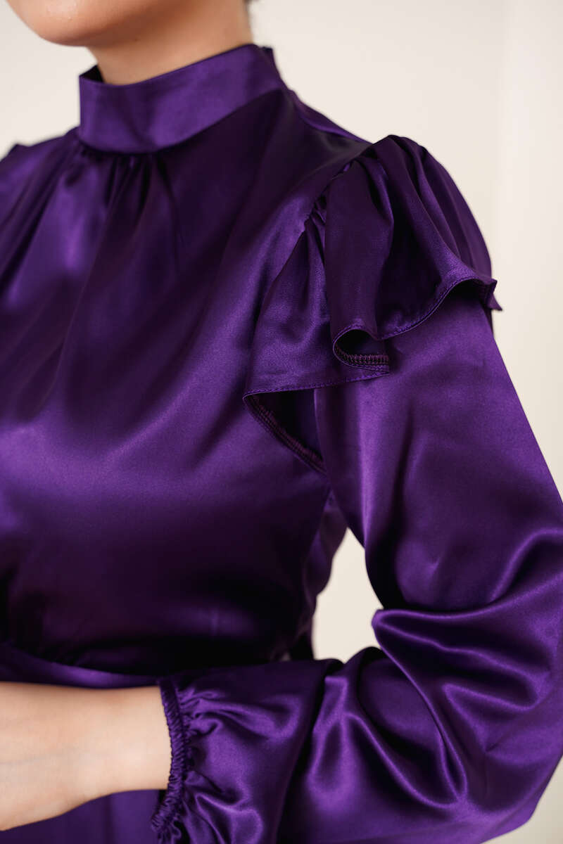 Omuz Fırfırlı Saten Elbise Mor