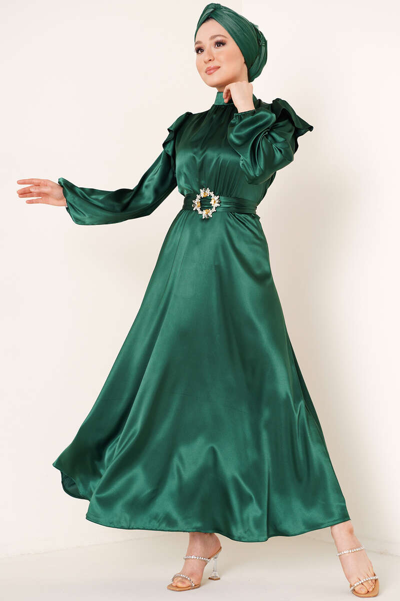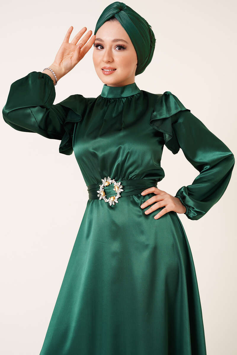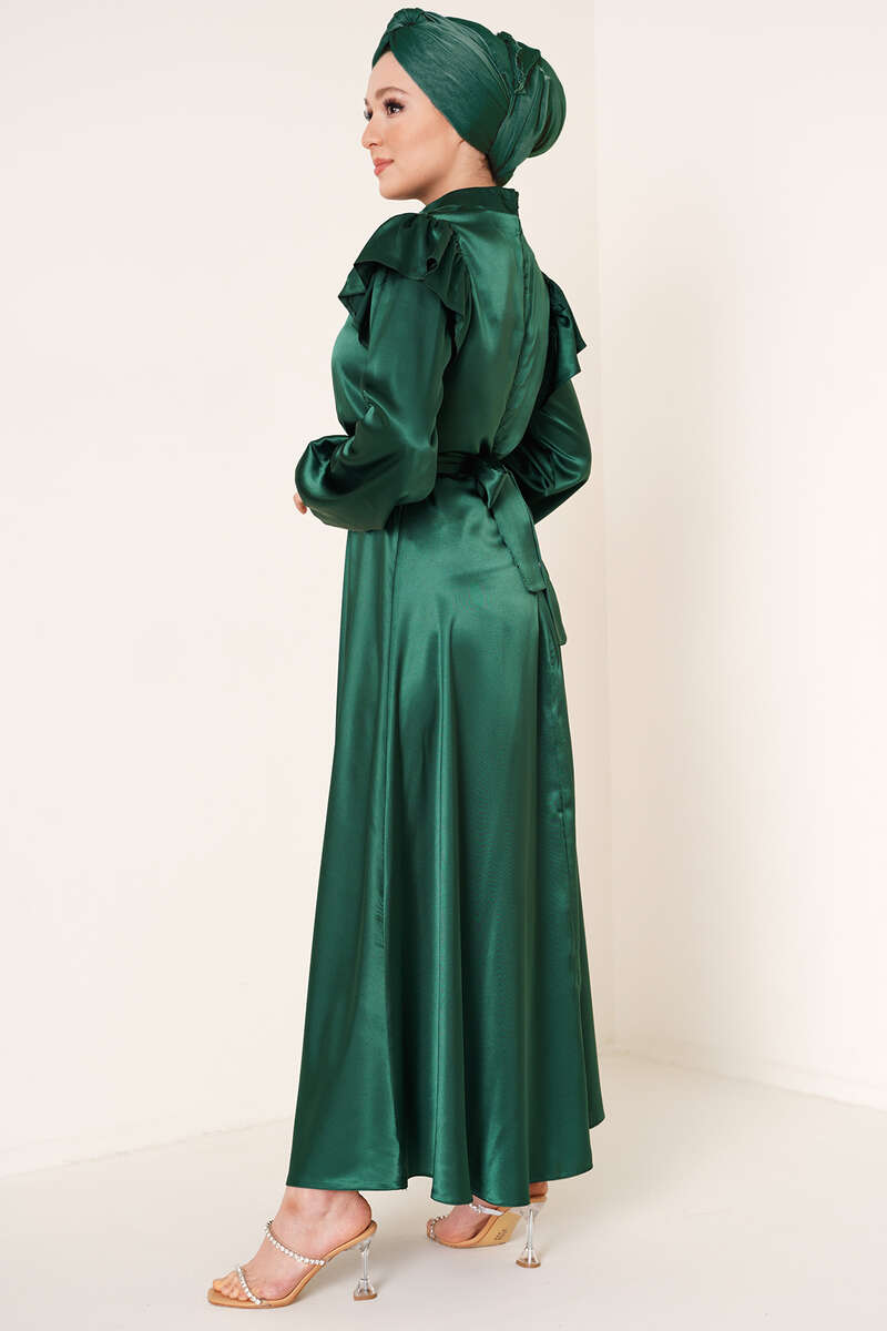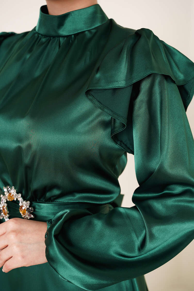 Şıklığınıza imzanızı atacağınız yeni sezon saten elbisemiz omuz fırfırlı modeliyle göz kamaştırmakta. Hakim yaka olan elbisemizin beli kuşaklıdır. Sırt fermuarlı elbisemizin bilekleri lastiklidir. Özel gün ve gecelerinizde size eşlik edecek elbisemizrenk seçenekleriyle sizi beklemekte. Kemer tokası aksesuar olarak kullanılmıştır.