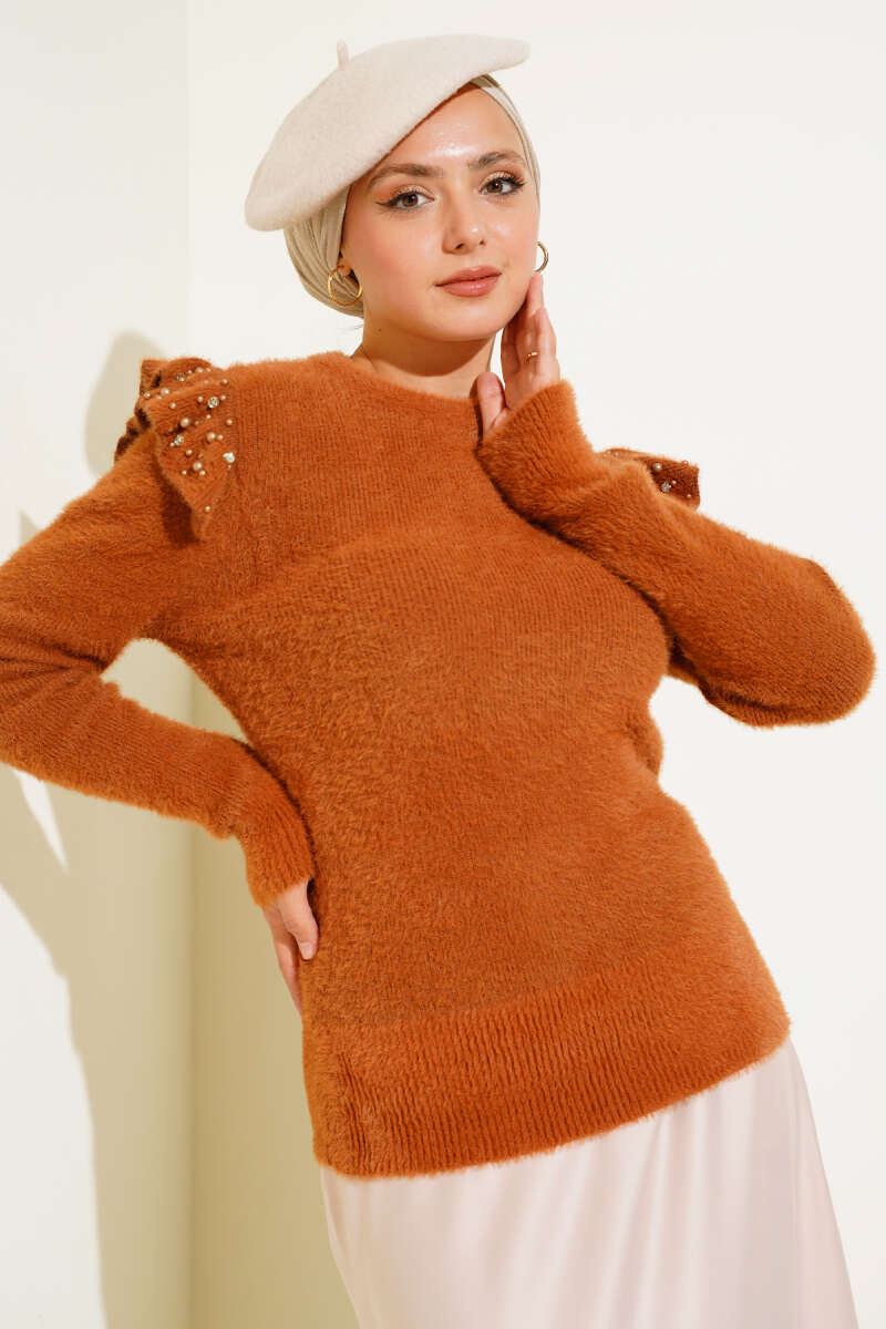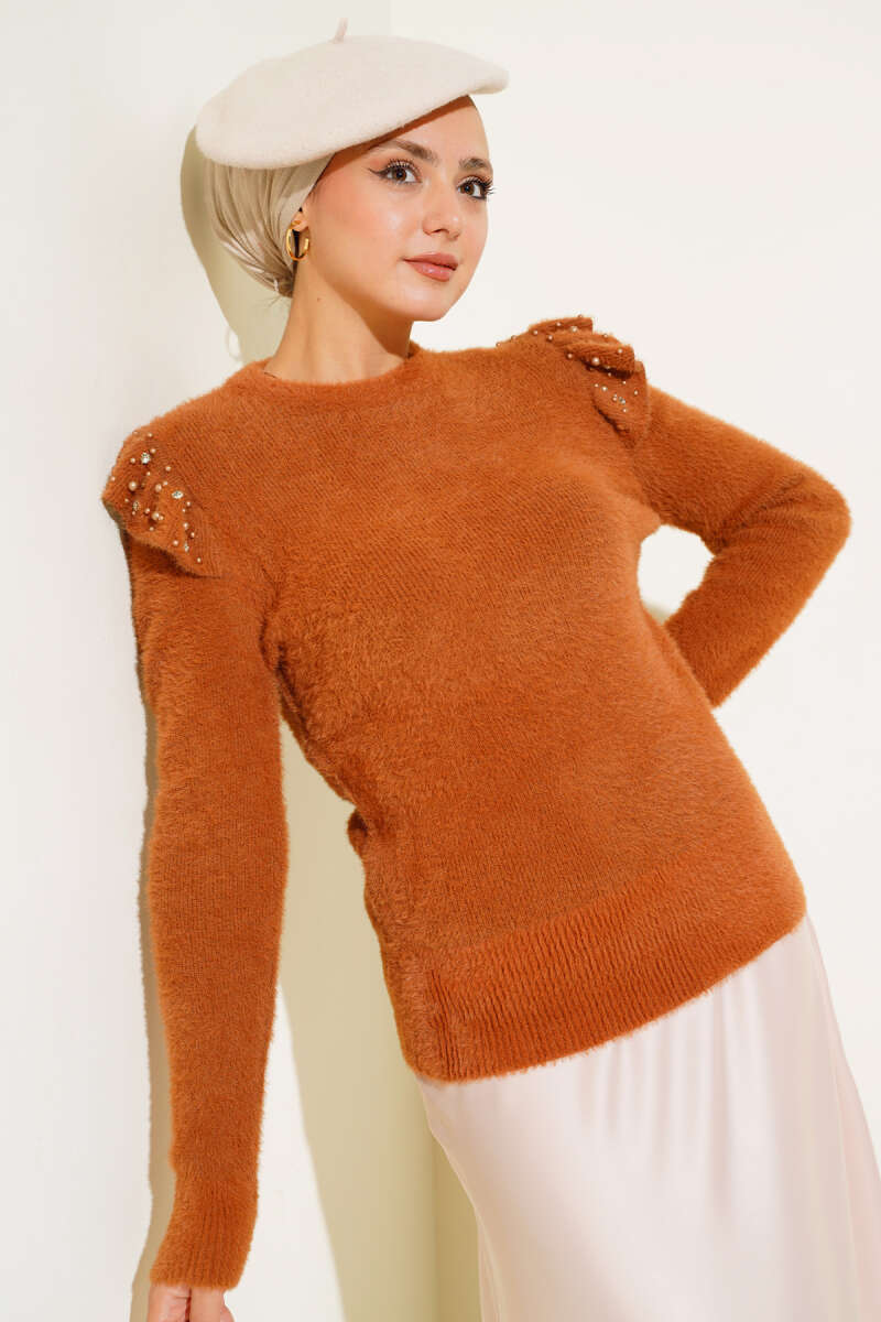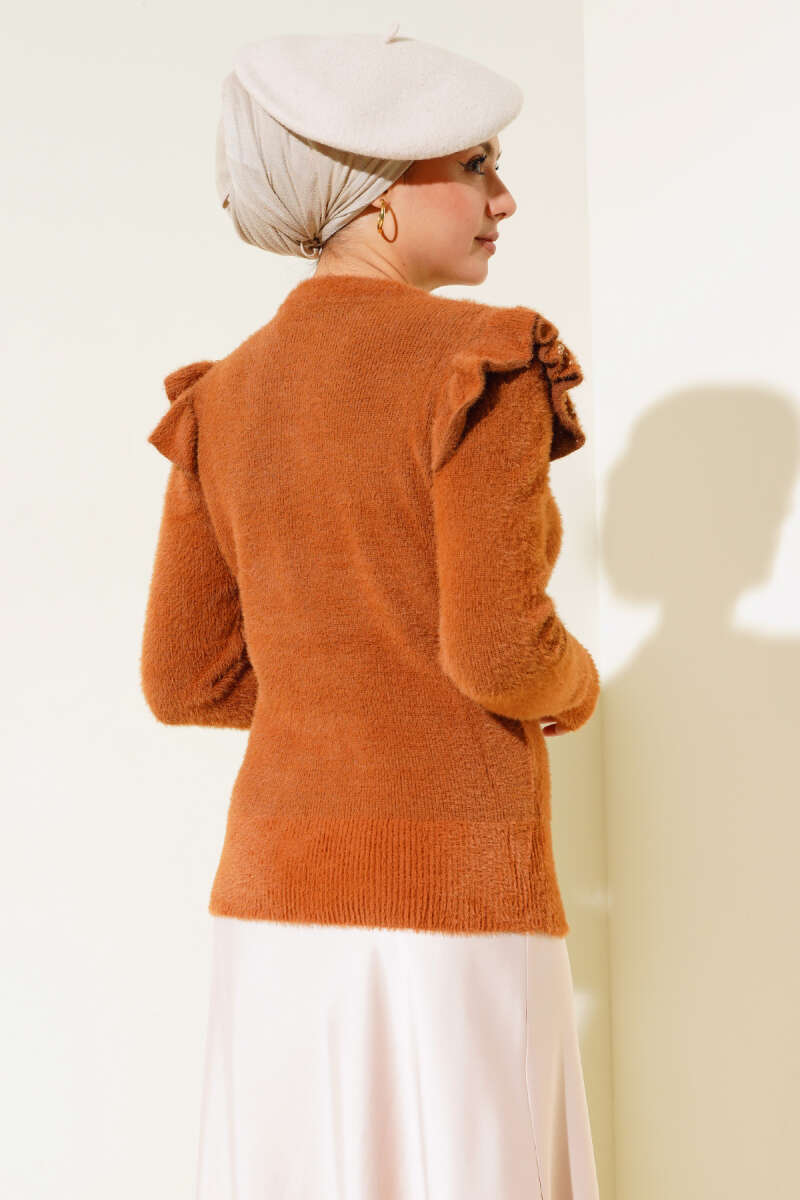 Omuz Fırfırlı Taşlı Triko Kazak Camel