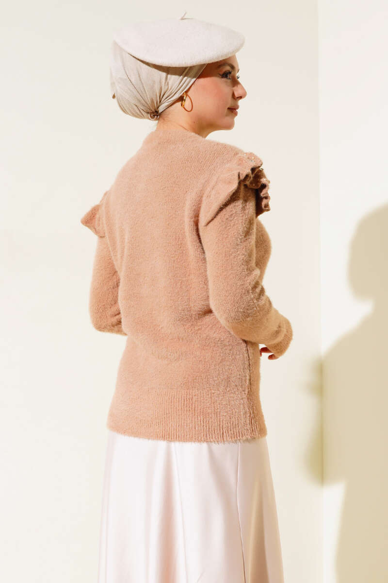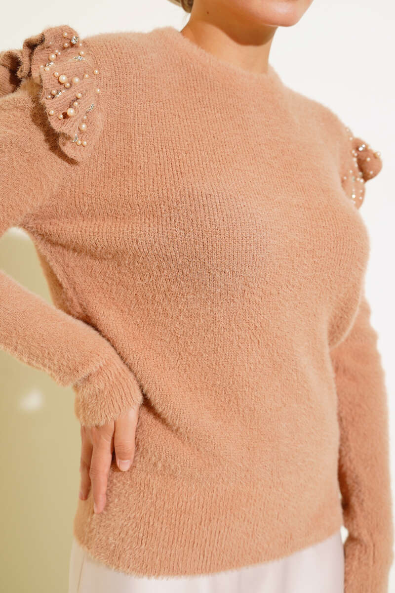 Omuz Fırfırlı Taşlı Triko Kazak Latte