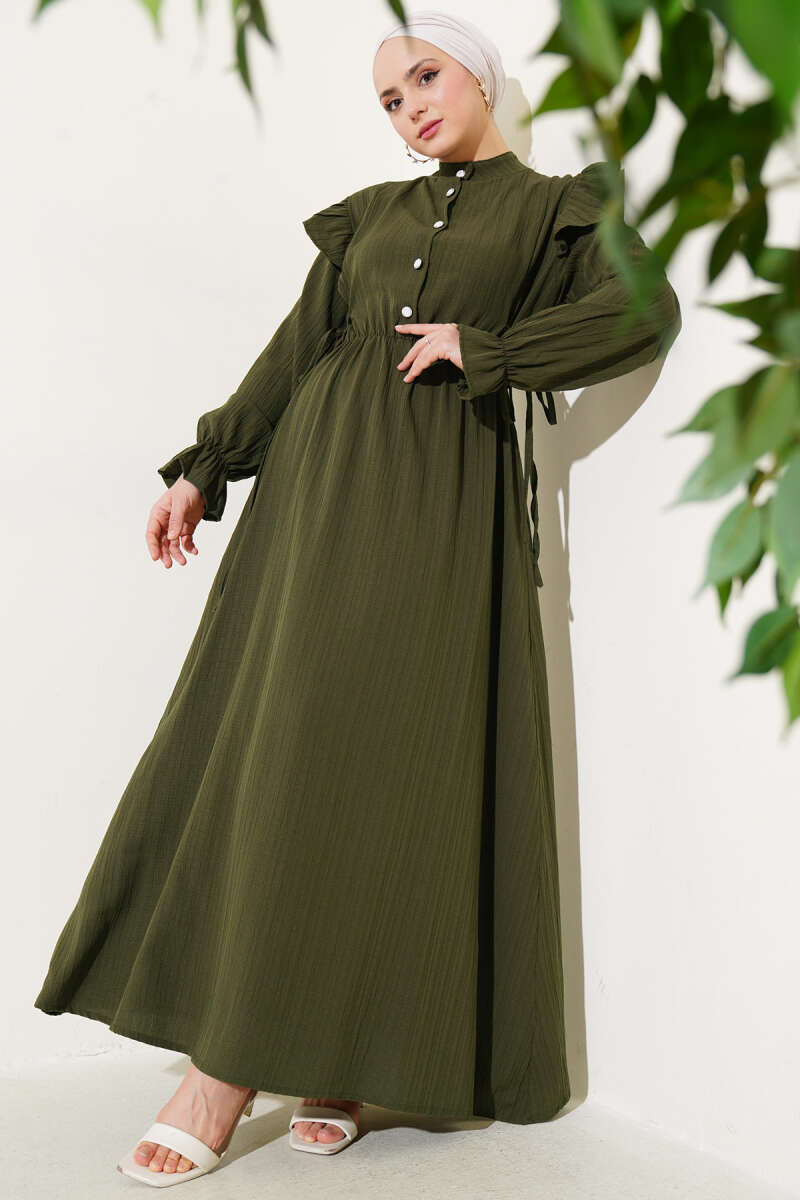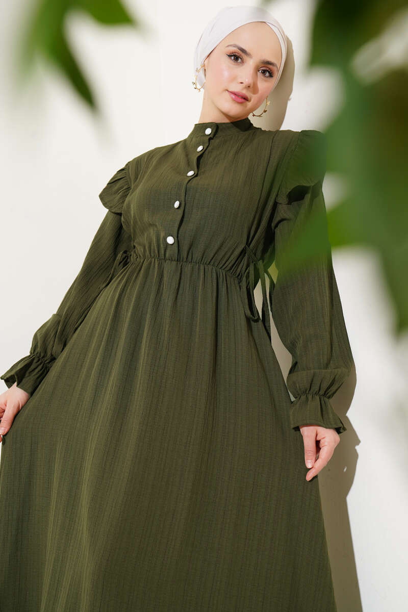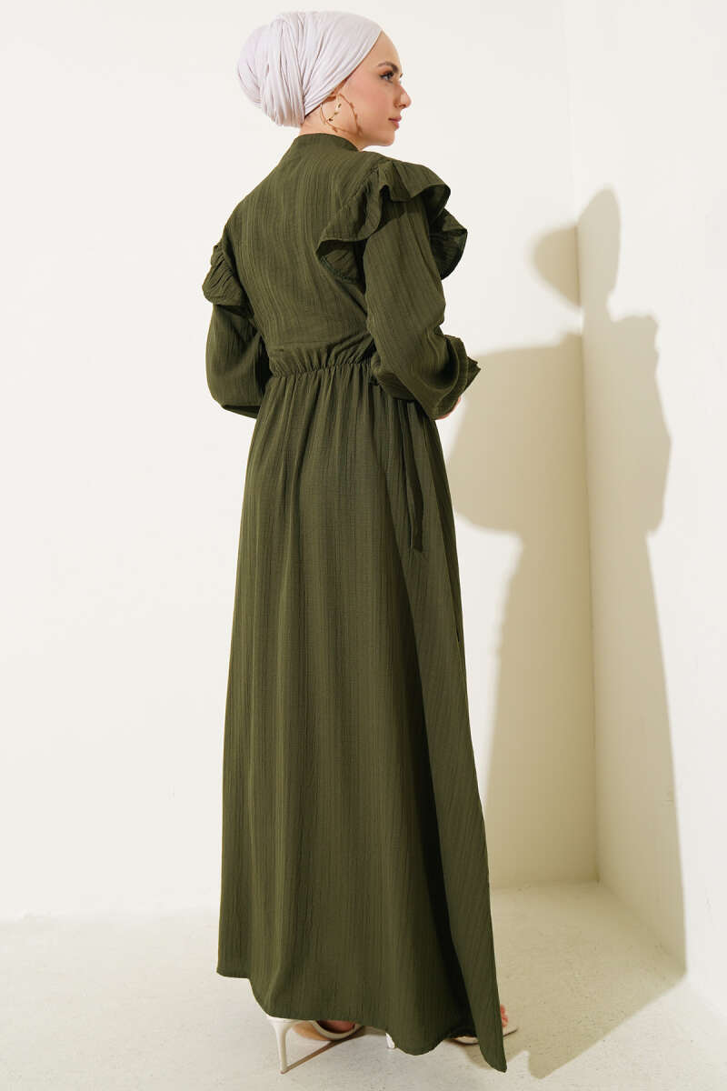 Omuz Fırfırlı Yan İp Bağcıklı Elbise Haki