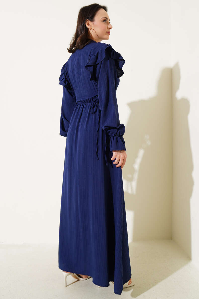 Kuşaklı Dik Fitilli Kaşe Elbise Lacivert
