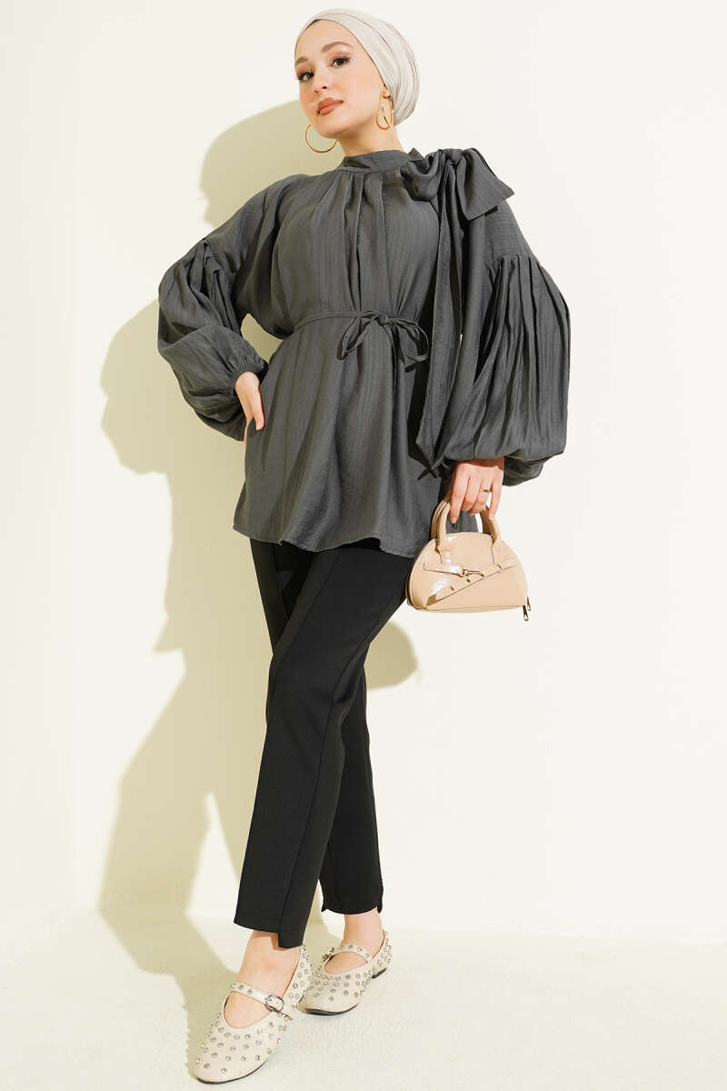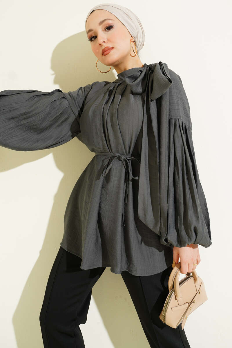 Düğmeli Yan Bağlamalı Kısa Gömlek Petrol