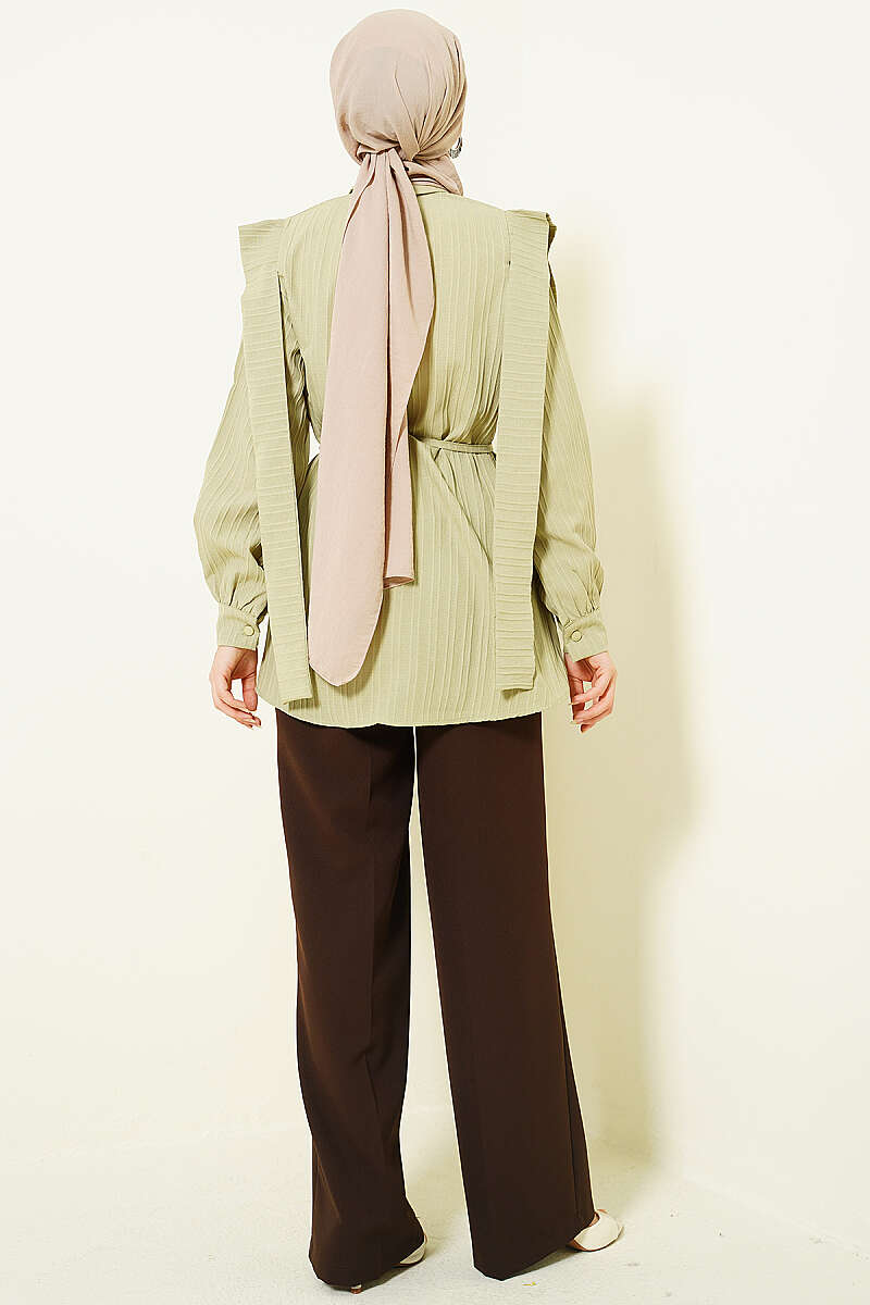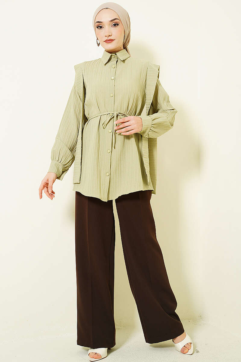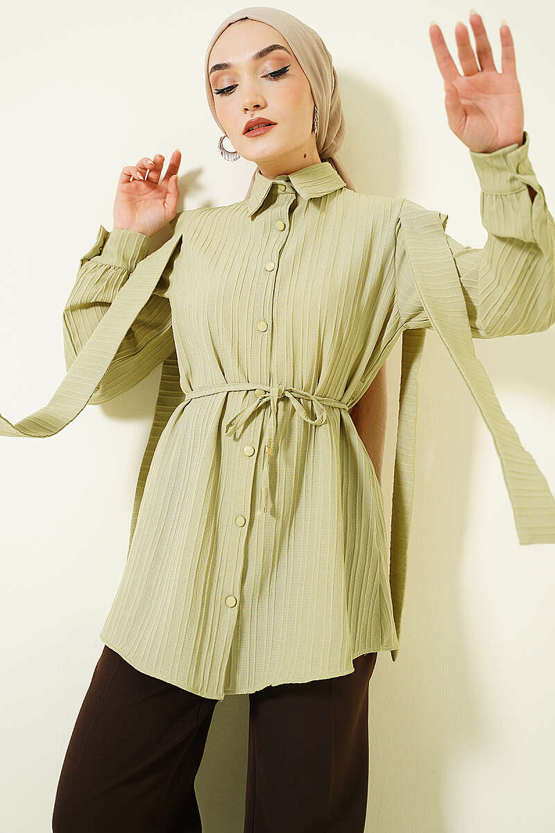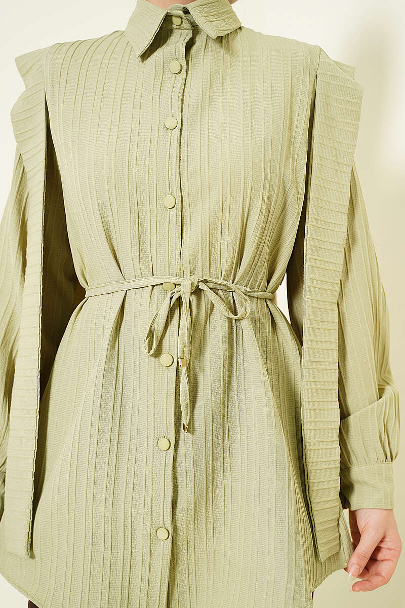 Omuz Kuşaklı Çizgi Kabartmalı Gömlek Çağla Yeşili