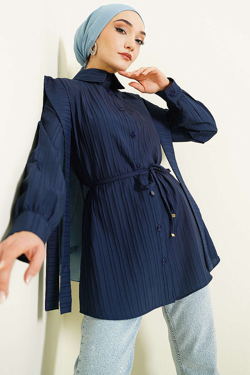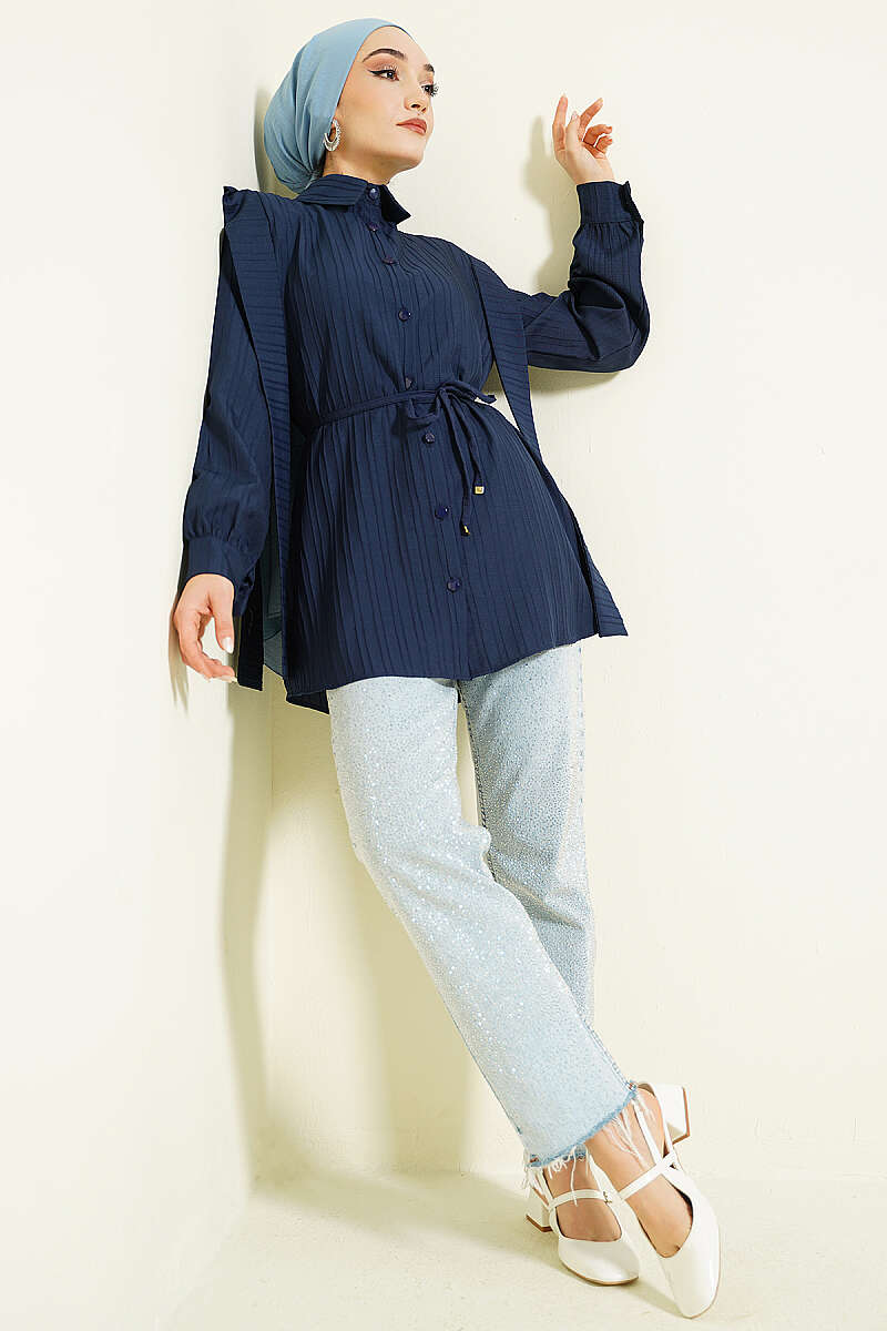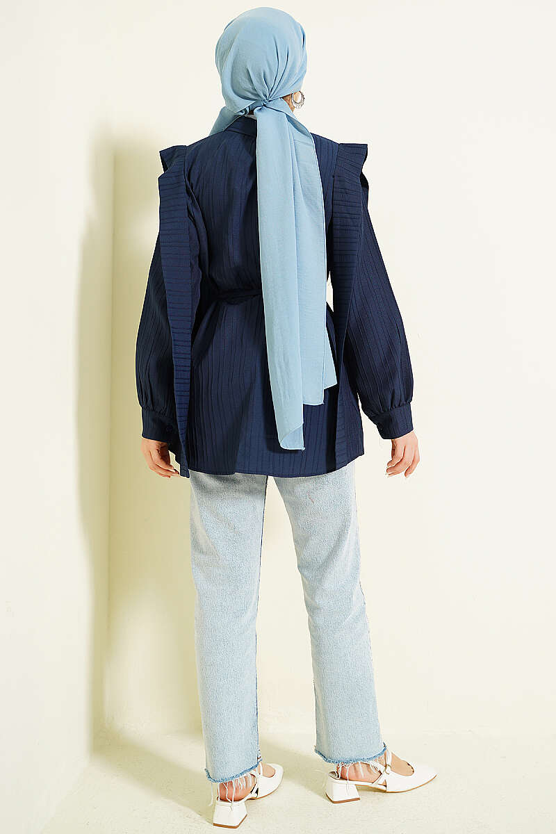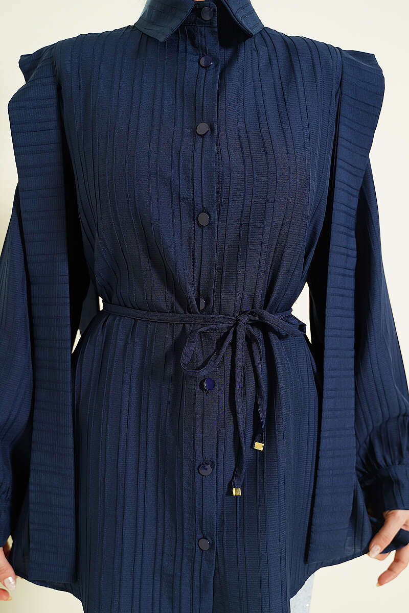 Omuz Kuşaklı Çizgi Kabartmalı Gömlek Lacivert
