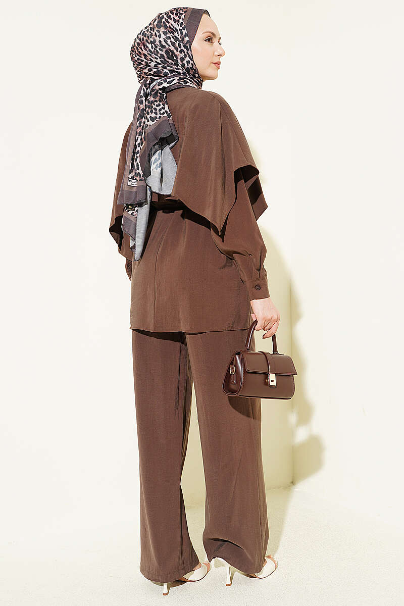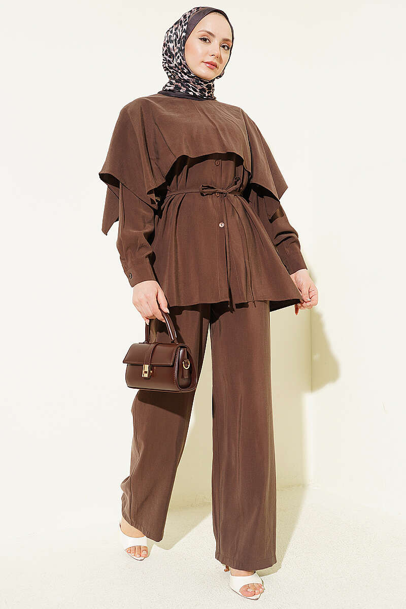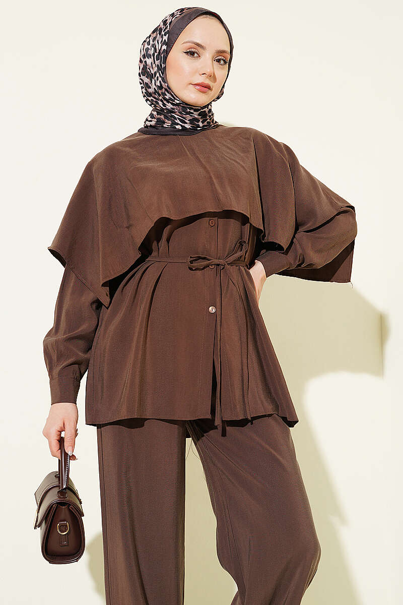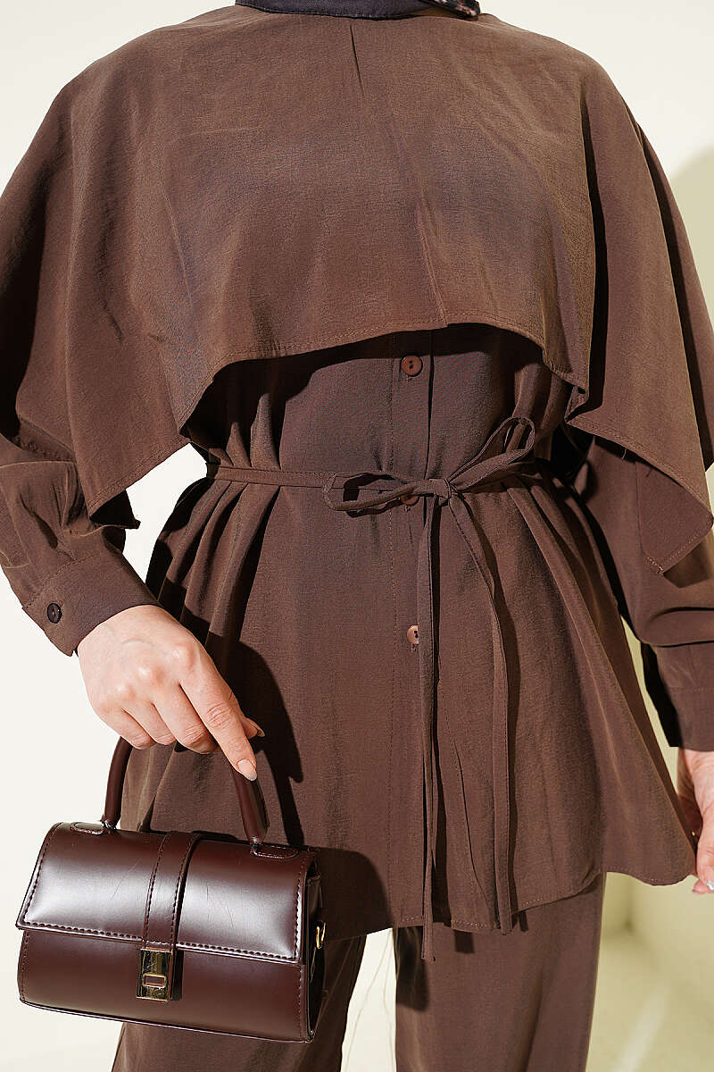 Omuz Pelerin Detaylı İp Kuşaklı Modal Takım Kahve