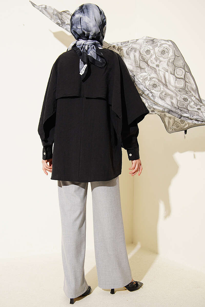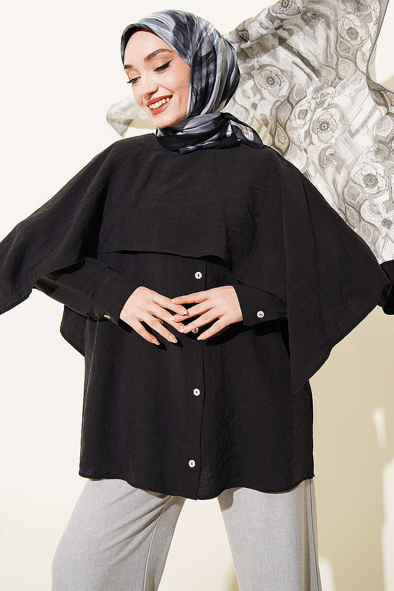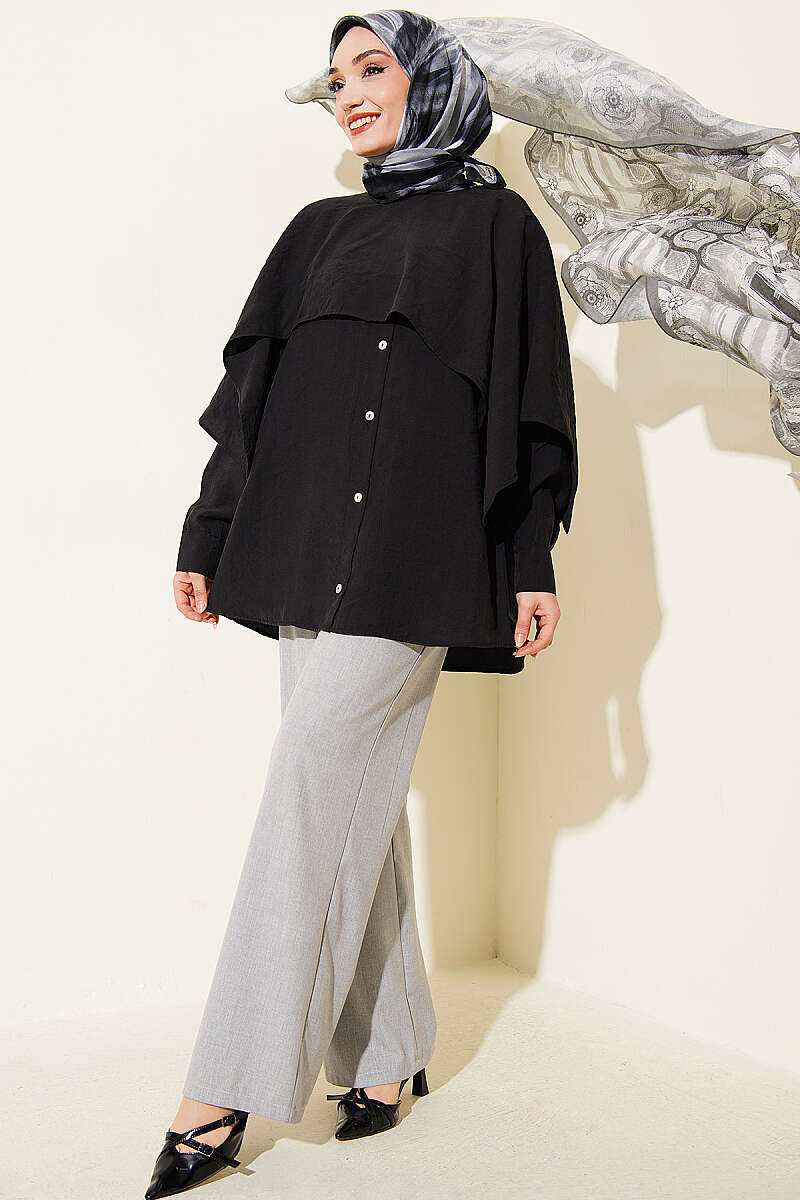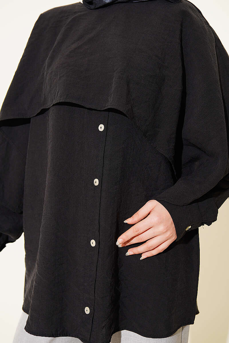 Omuz Pelerinli Düğme Detaylı Tunik Siyah