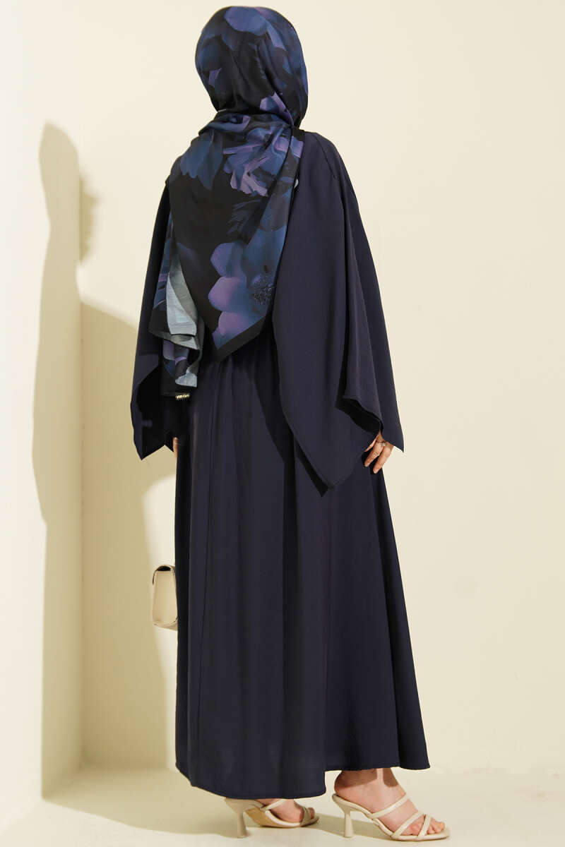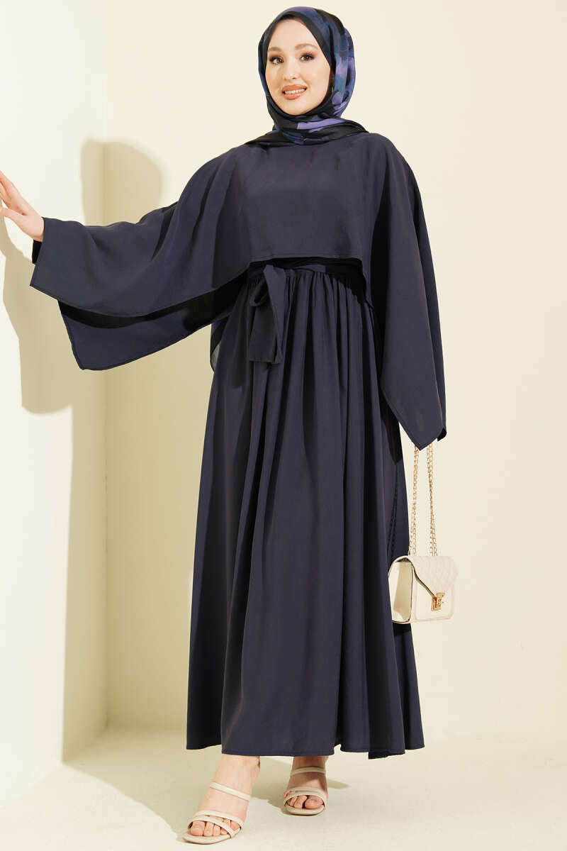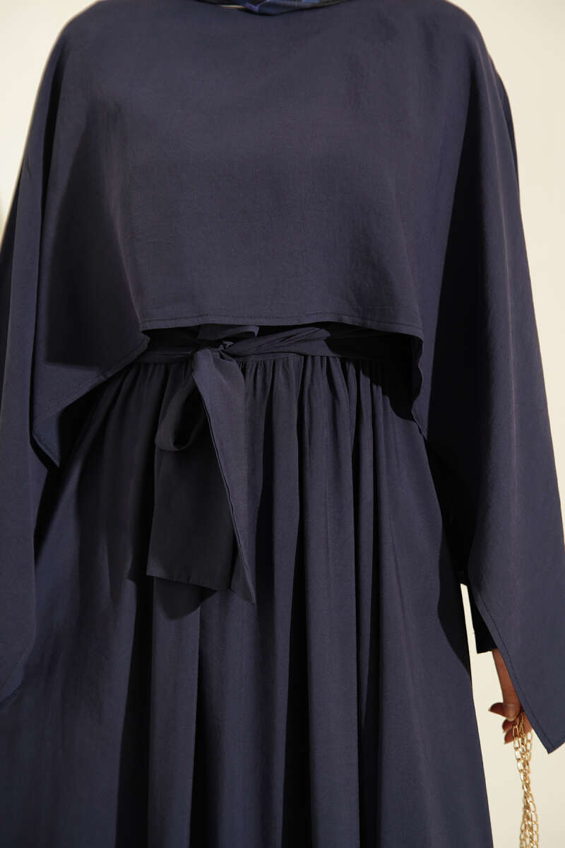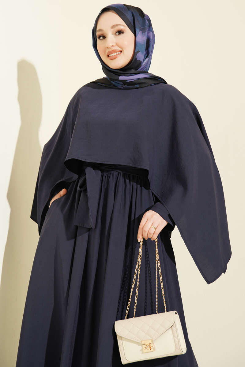 Omuz Pelerinli Kuşaklı Modal Elbise Lacivert