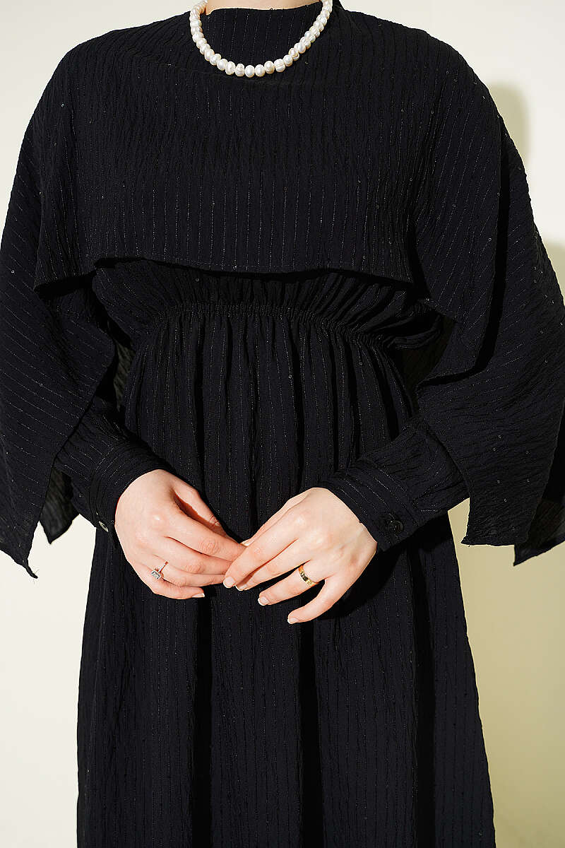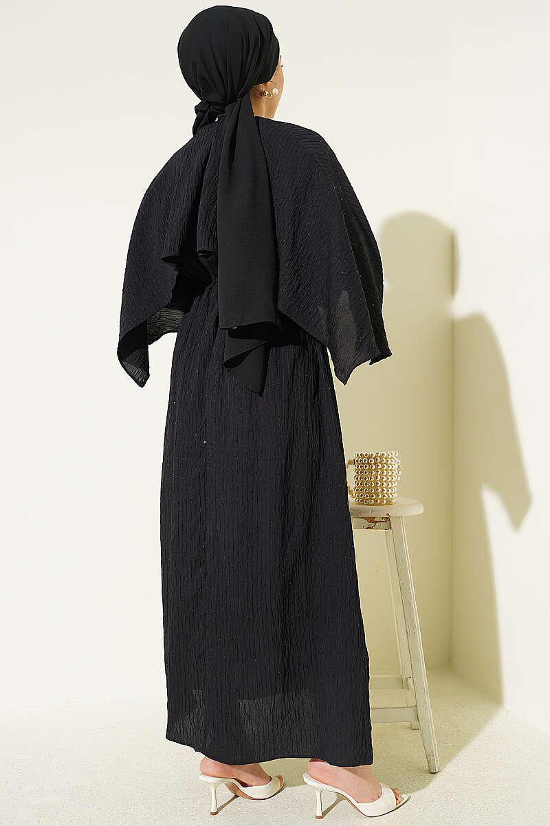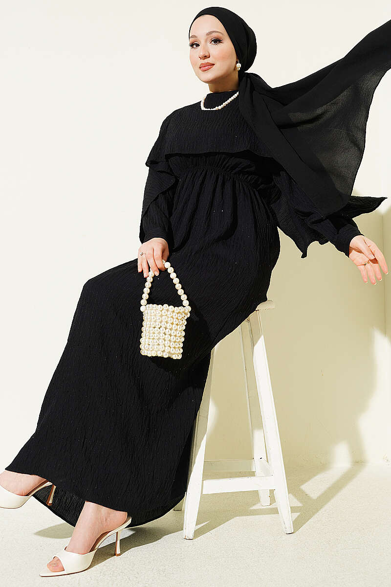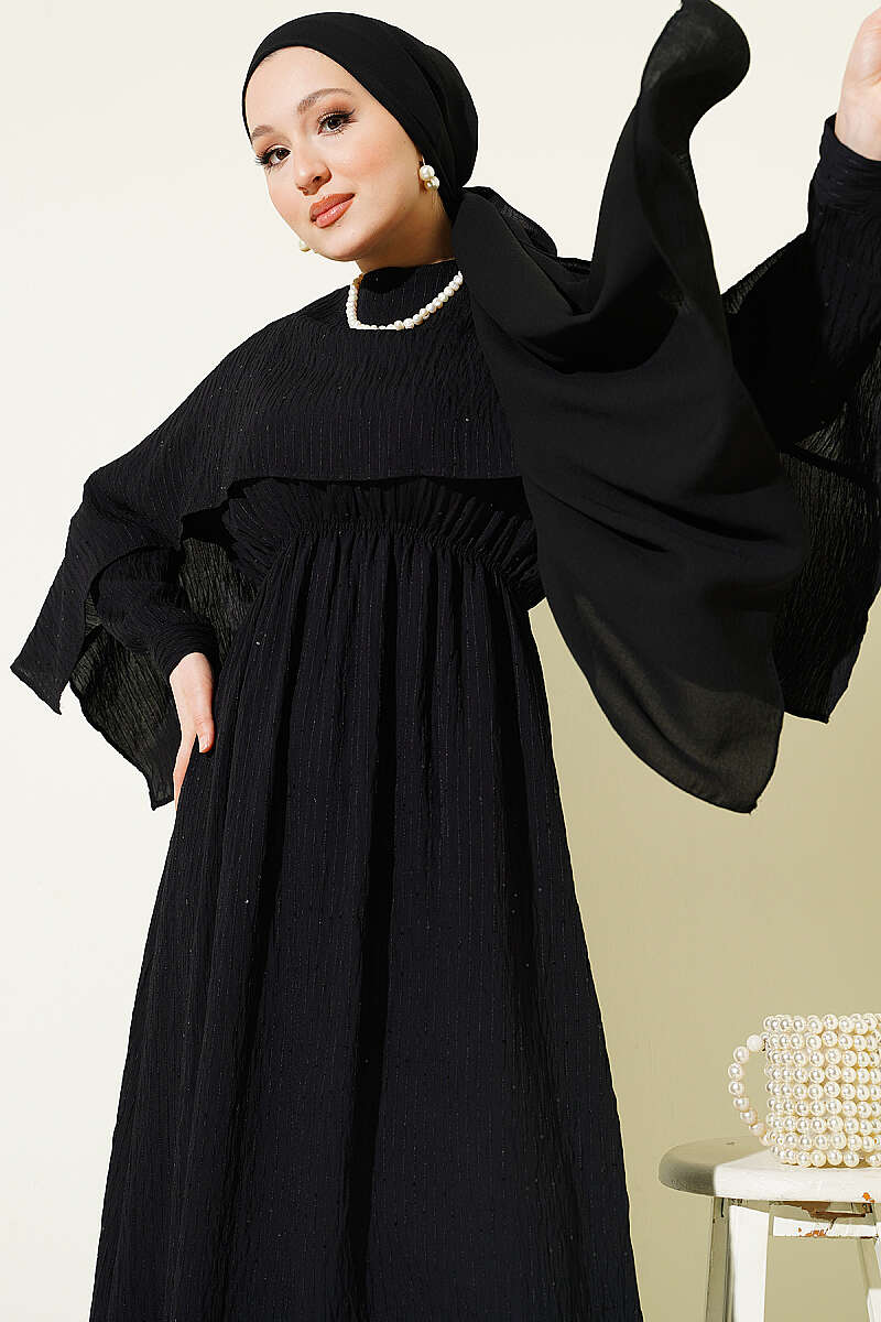 Omuz Pelerinli Pul Detaylı Elbise Siyah