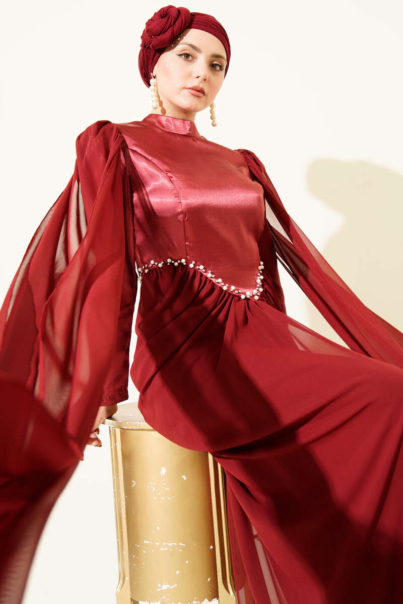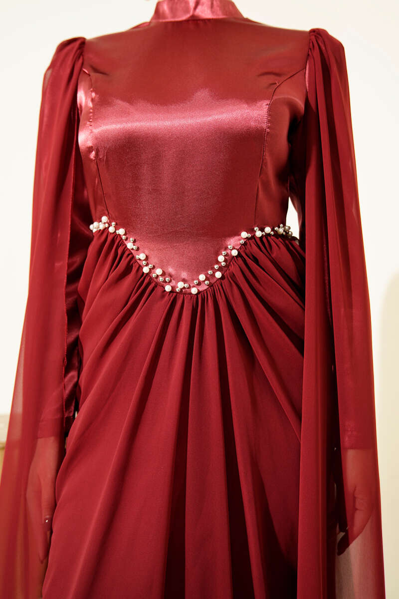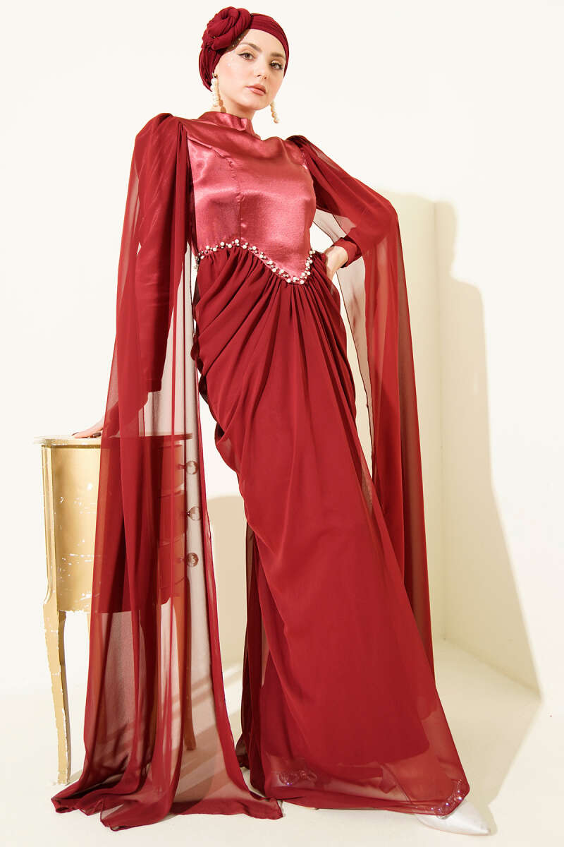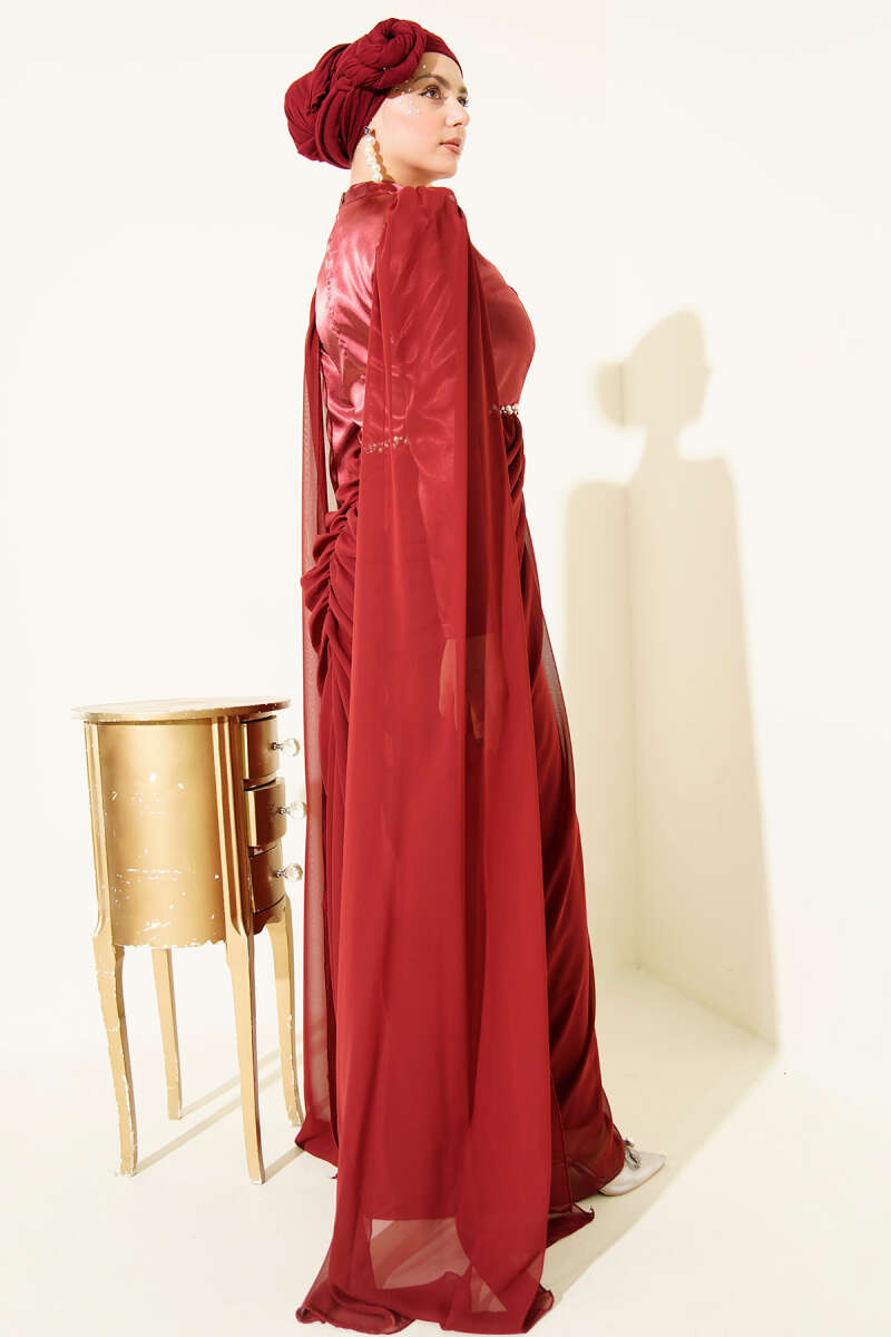 Çiçek Motifli Tül Pelerinli Abiye Elbise Bordo