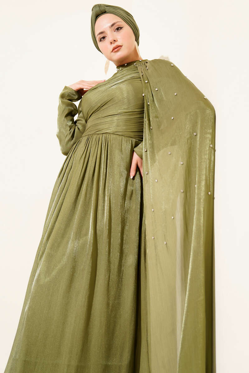 Kendinden Desenli Tül Kuşak Abiye Elbise Haki