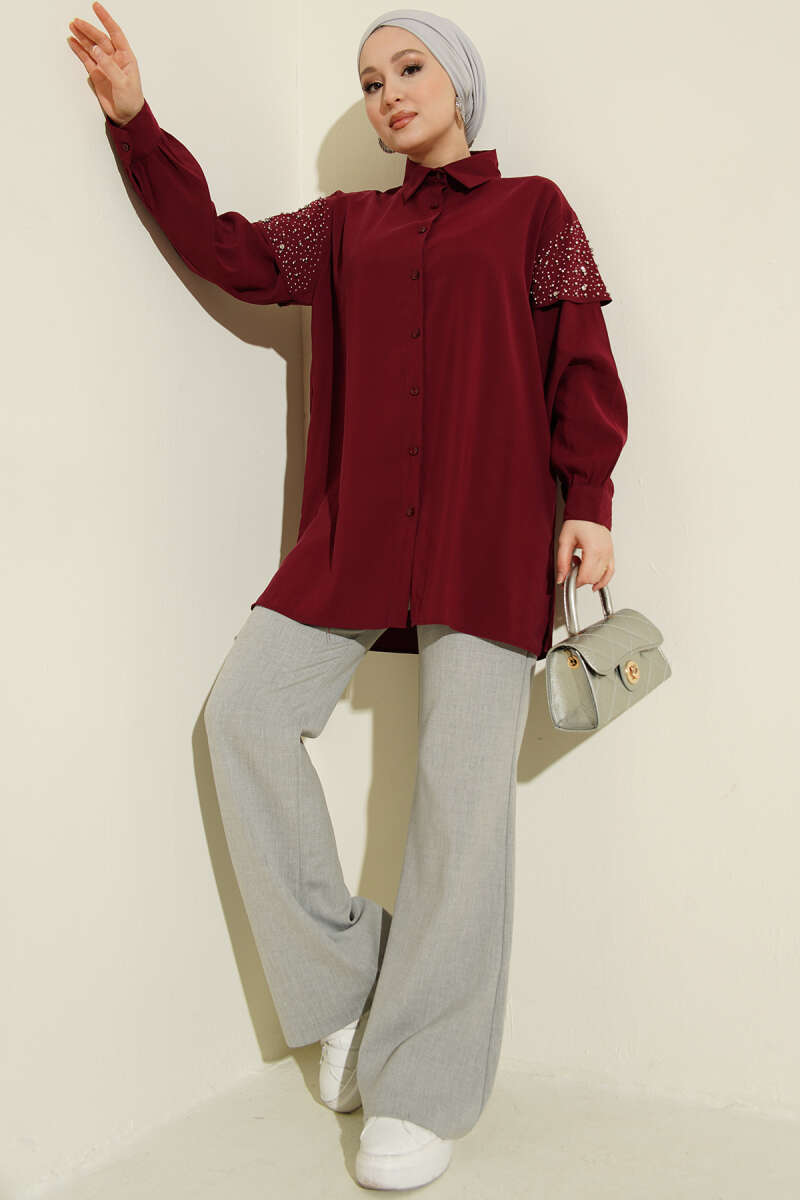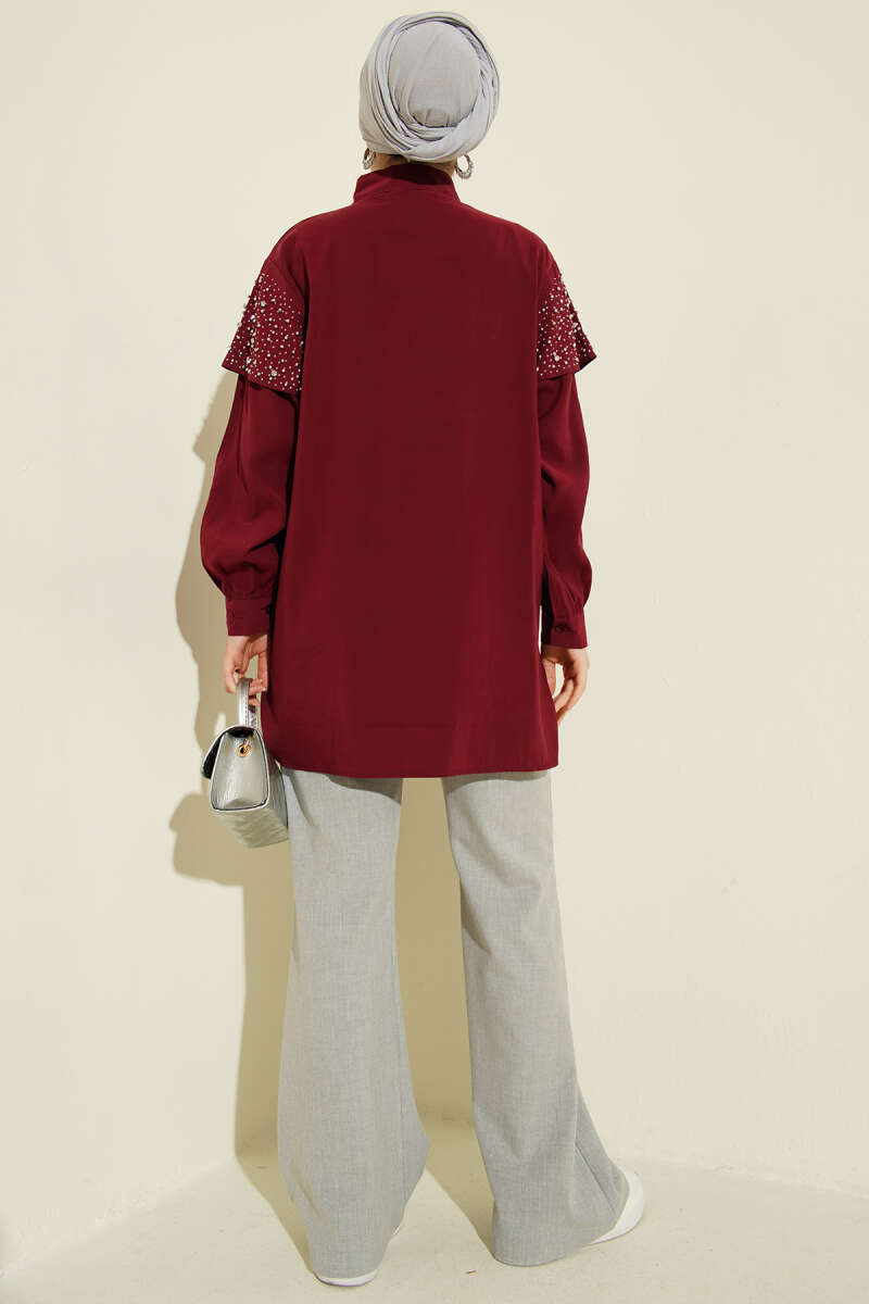Omuz Pelerinli Taşlı Tensel Gömlek Bordo