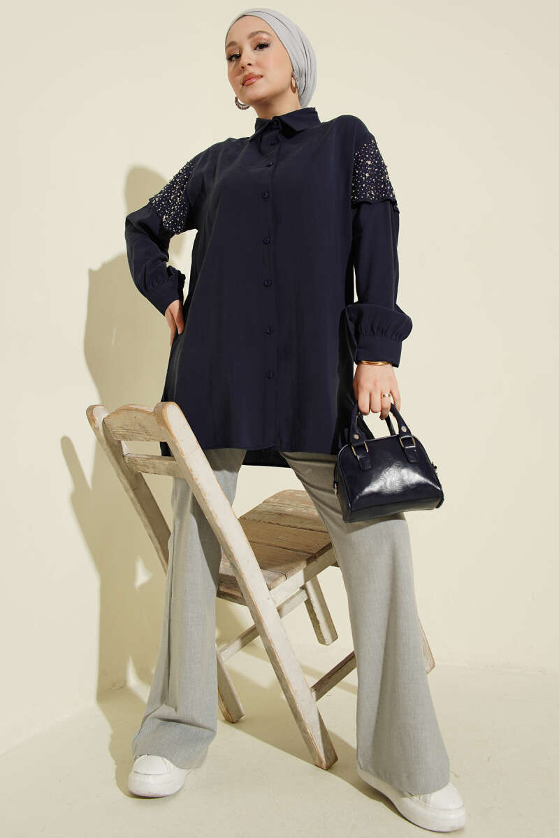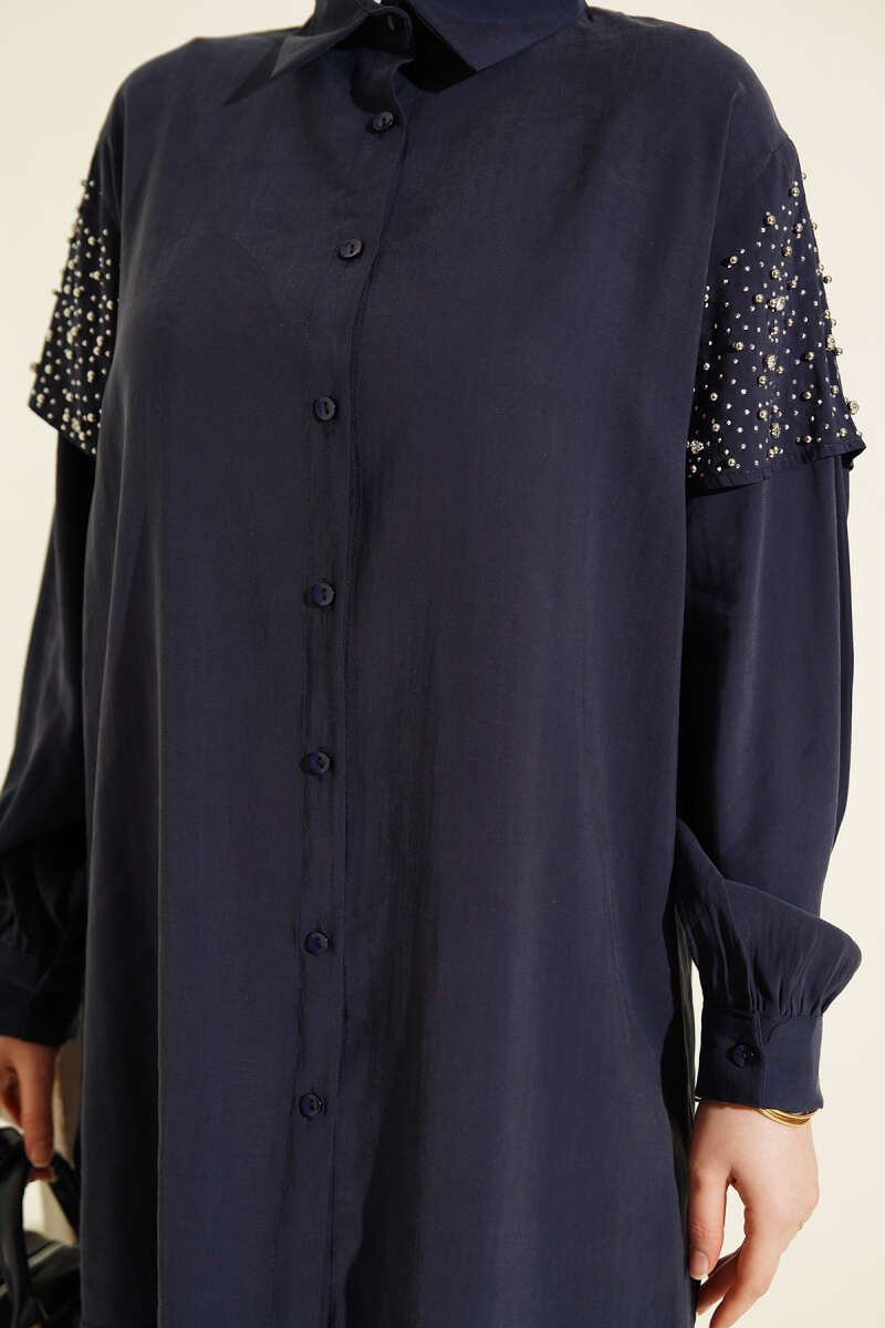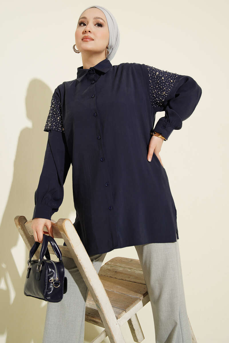 Omuz Pelerinli Taşlı Tensel Gömlek Lacivert