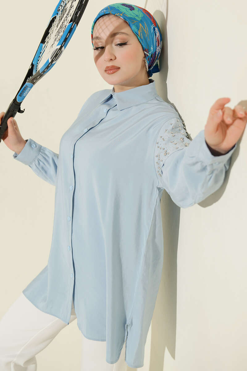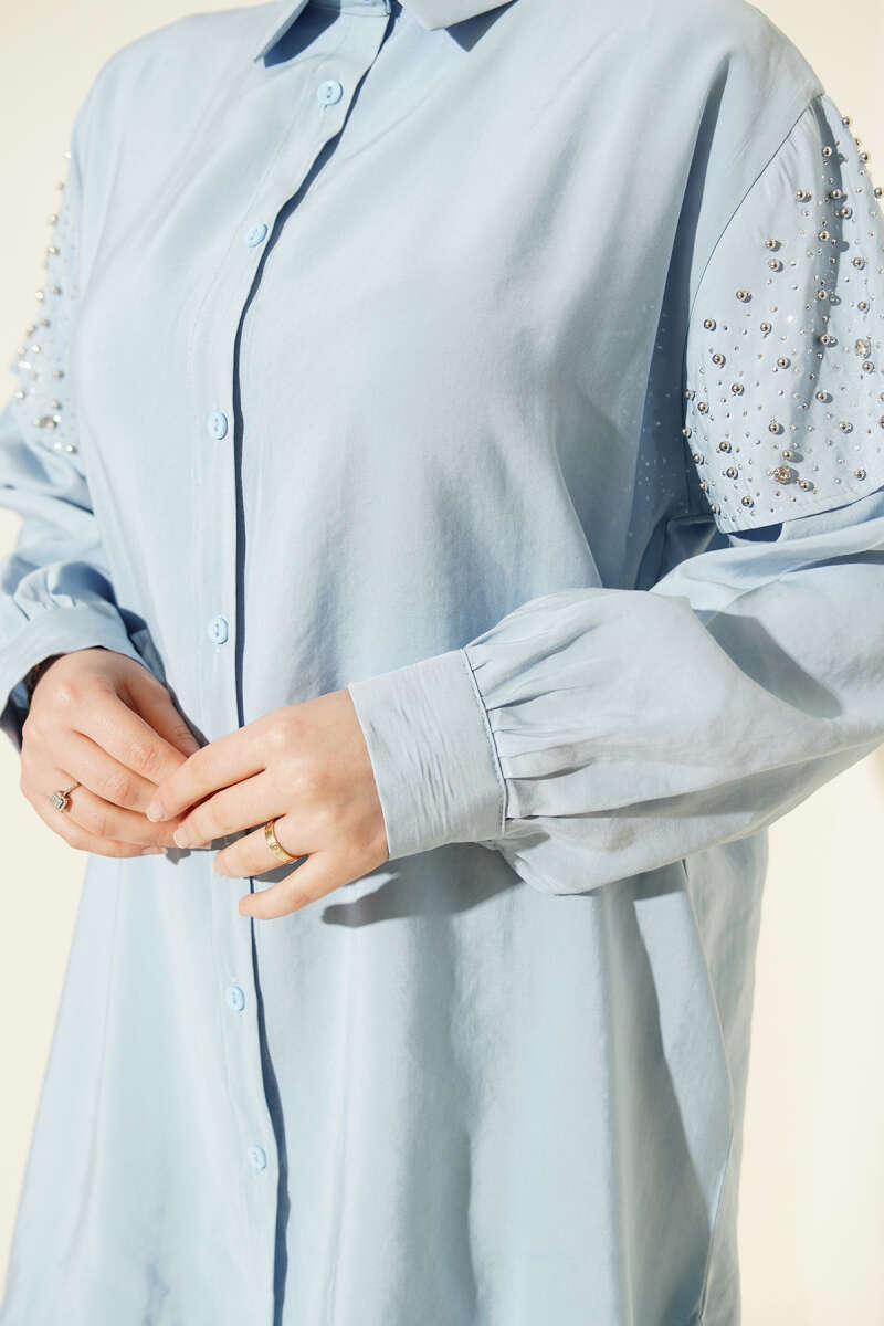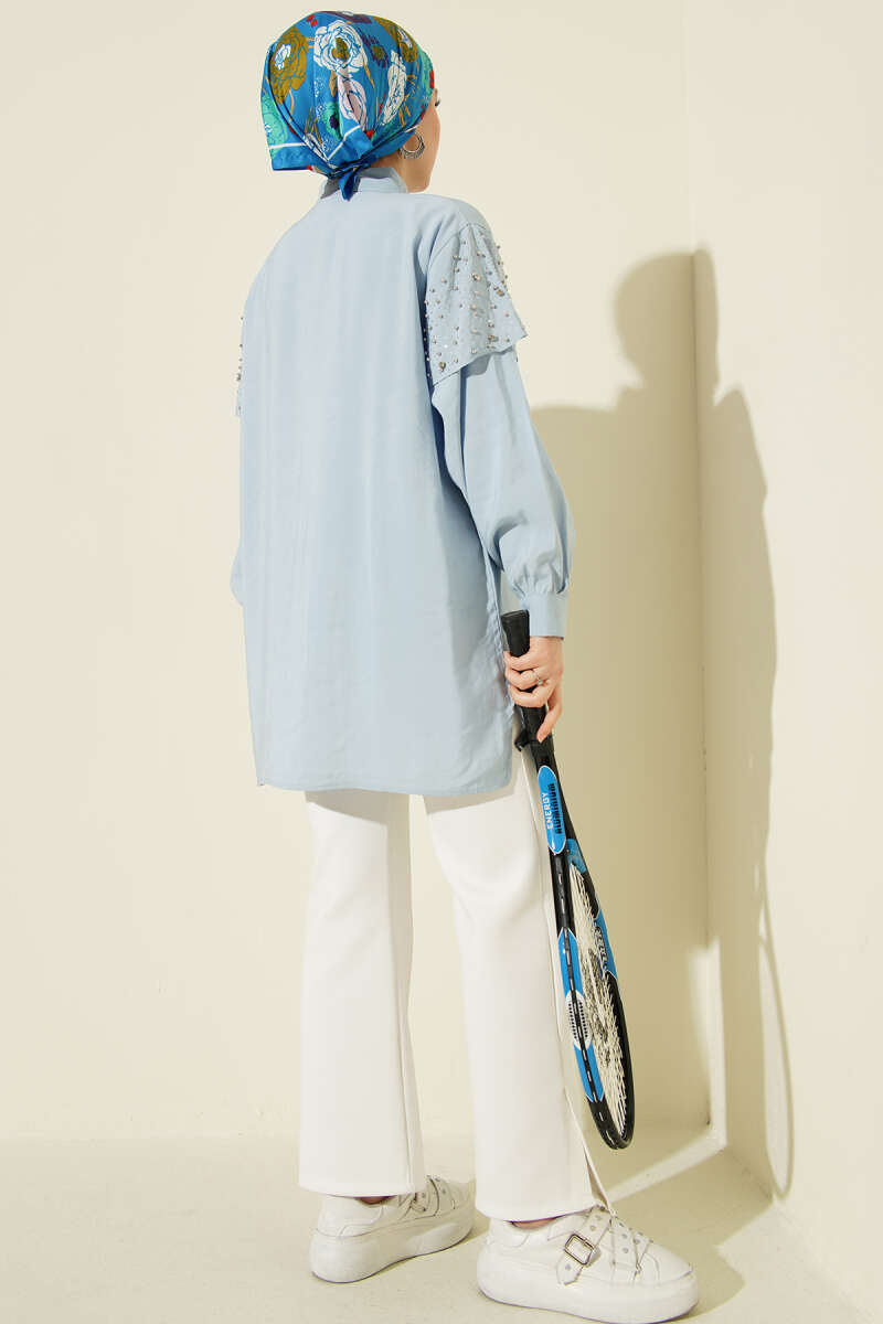 Omuz Pelerinli Taşlı Tensel Gömlek Lacivert