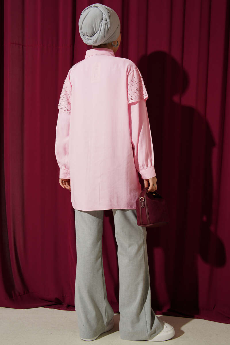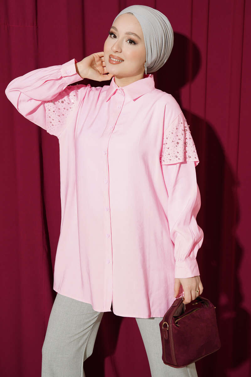 Omuz Pelerinli Taşlı Tensel Gömlek Vizon