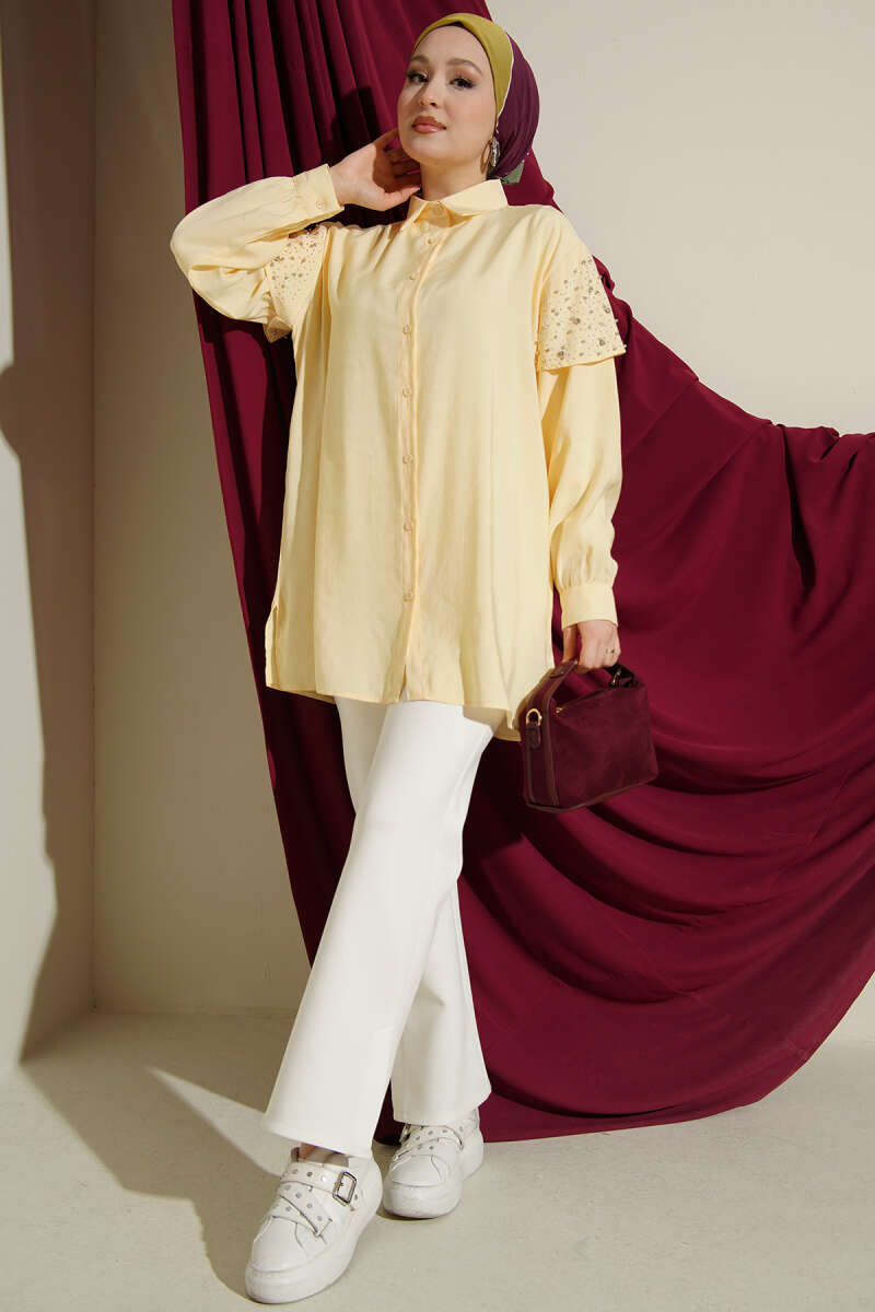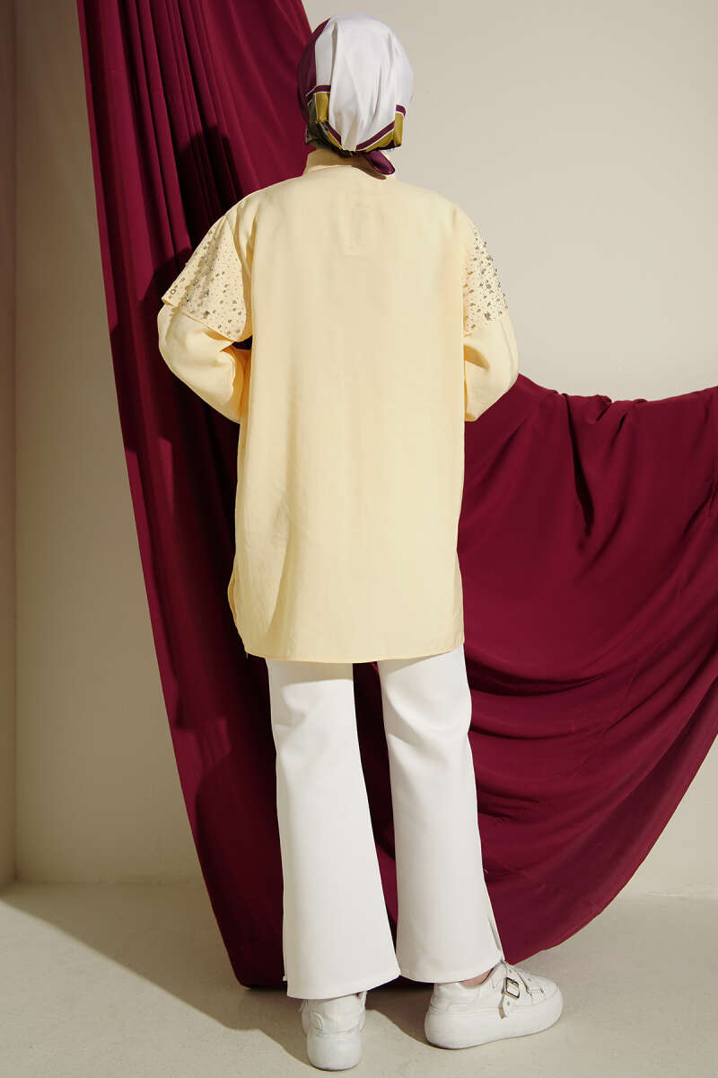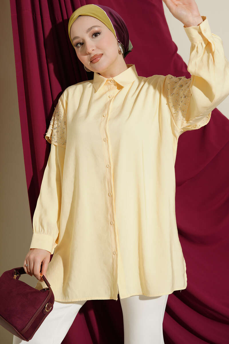Omuz Pelerinli Taşlı Tensel Gömlek Vizon