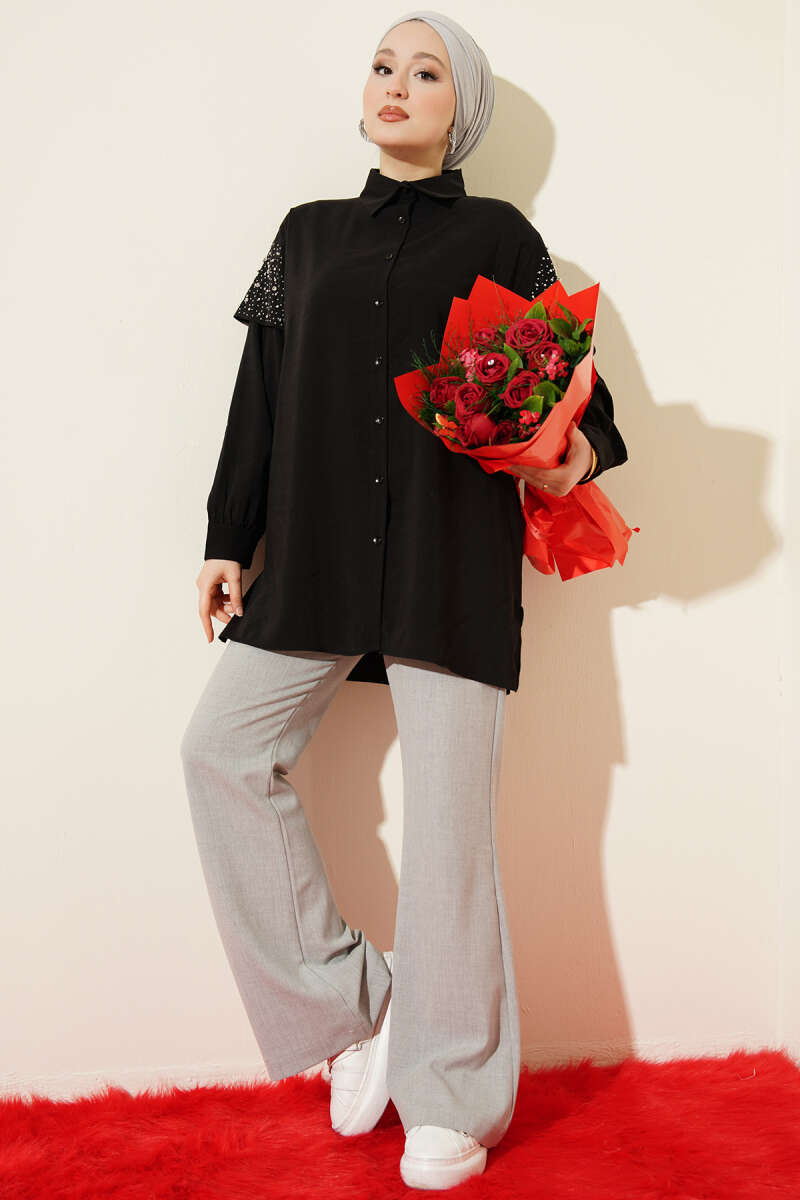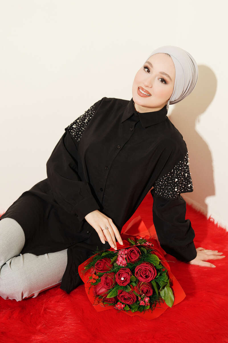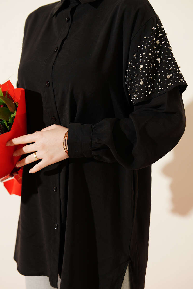 Omuz Pelerinli Taşlı Tensel Gömlek Siyah