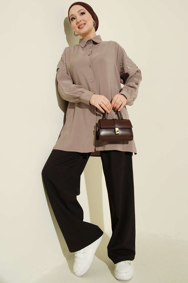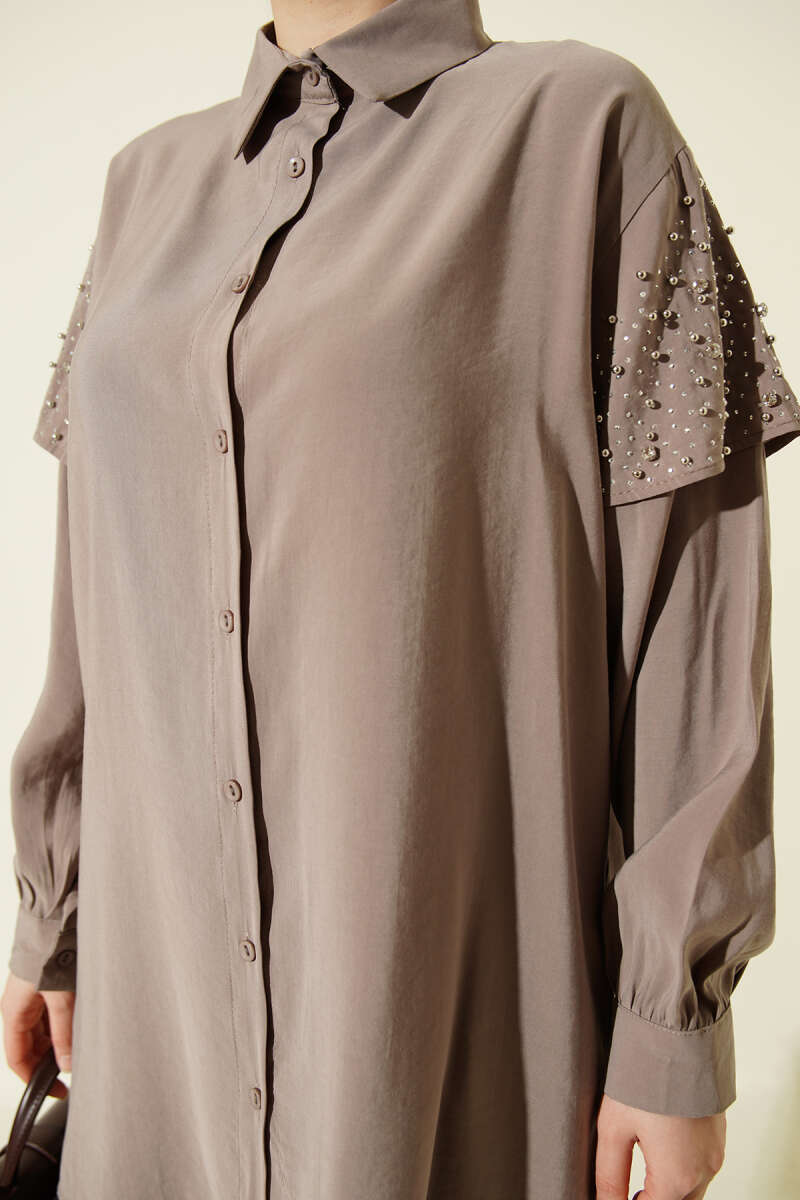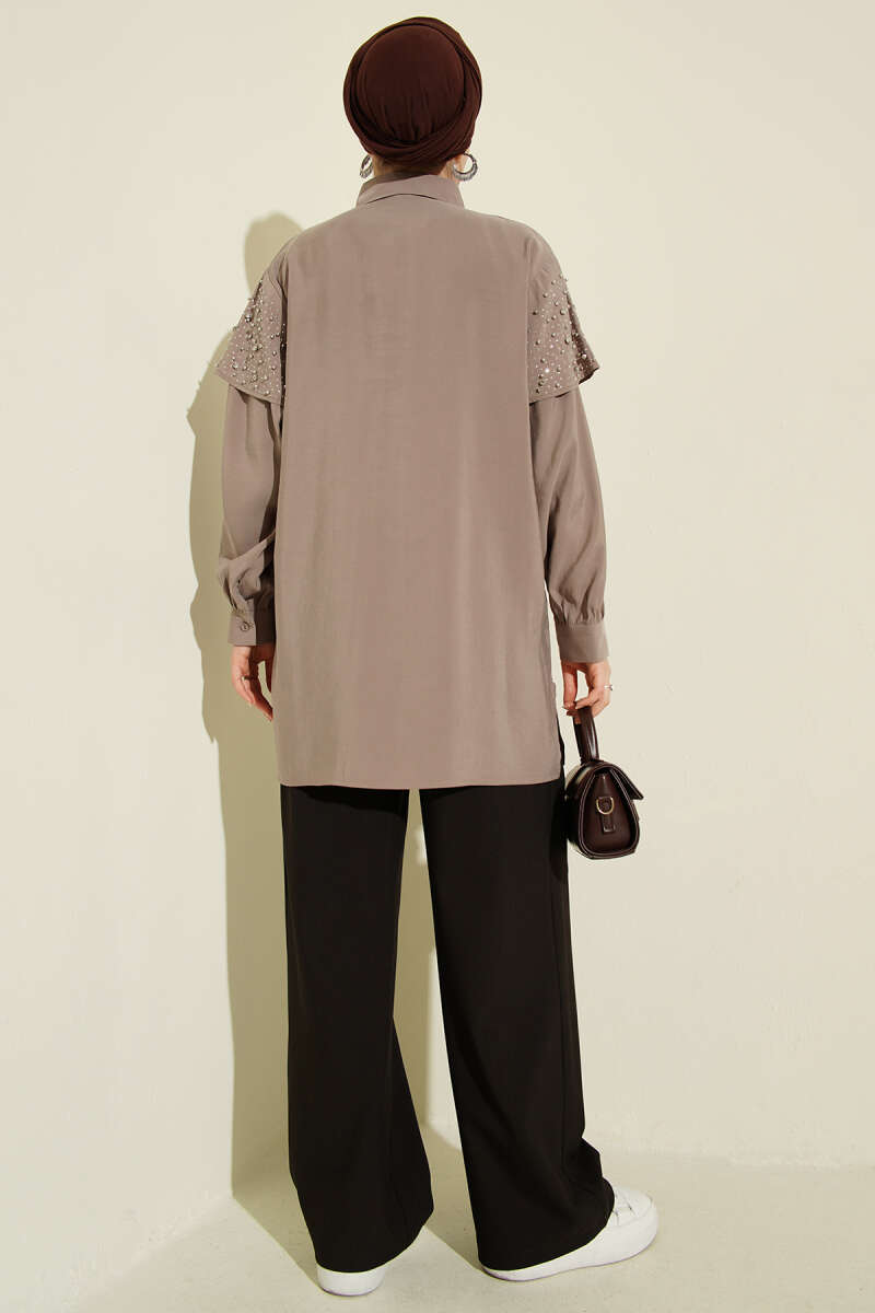 Omuz Pelerinli Taşlı Tensel Gömlek Vizon