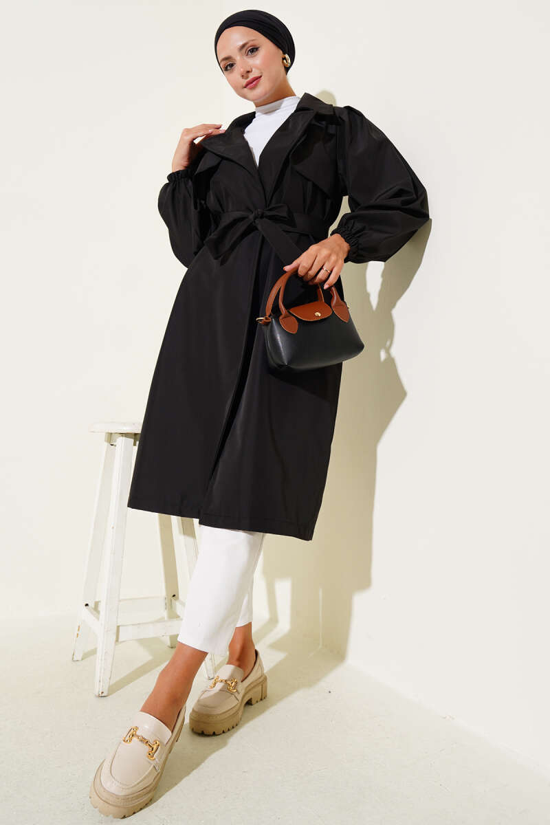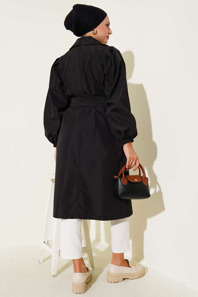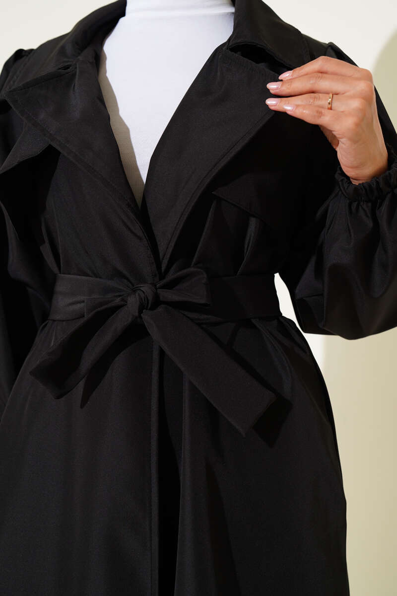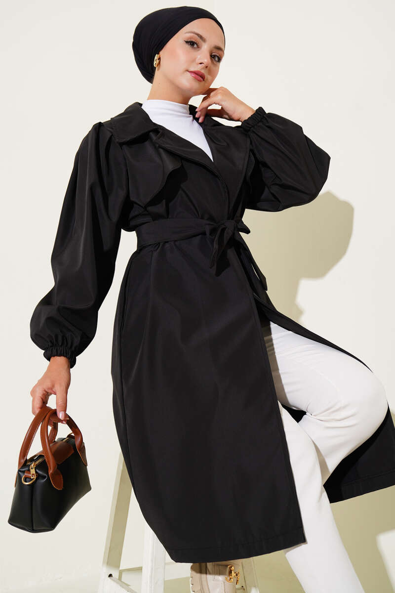 Omuz Pile Detaylı Parçalı Trençkot Siyah