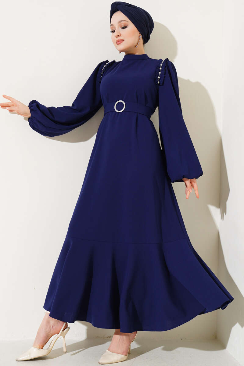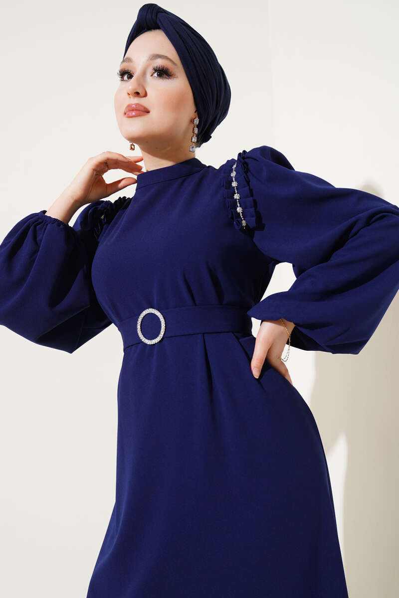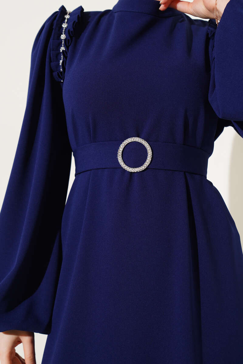 Omuz Pileli Taşlı Elbise Lacivert