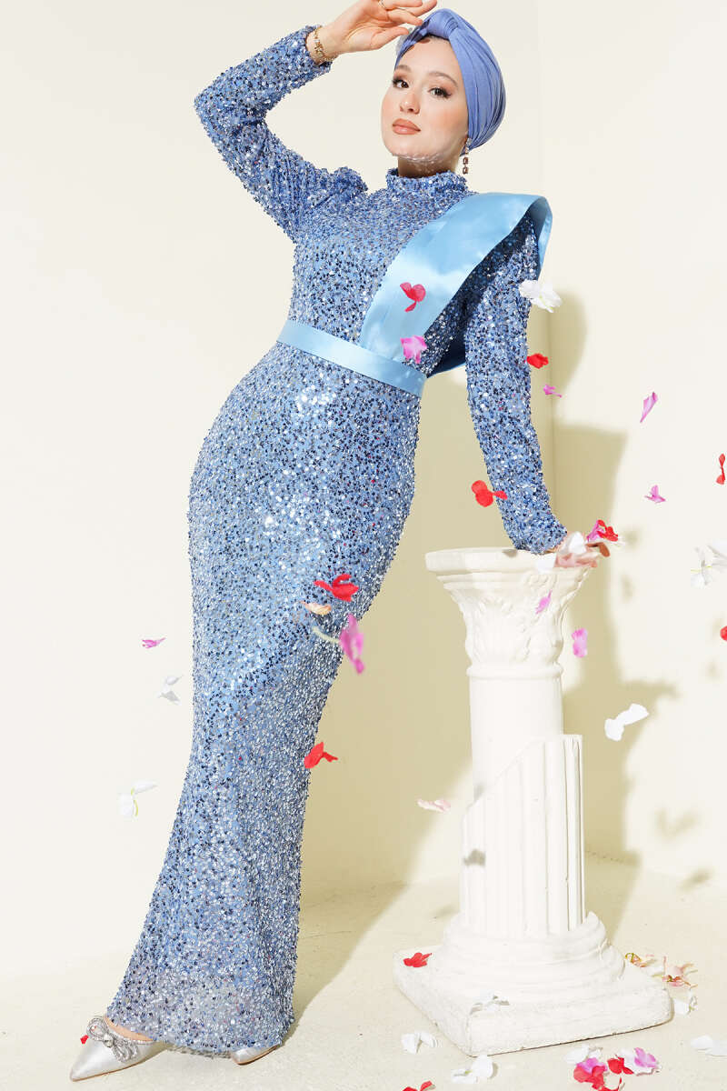 Omuz Saten Parçalı Pul Payet Abiye Elbise Lacivert