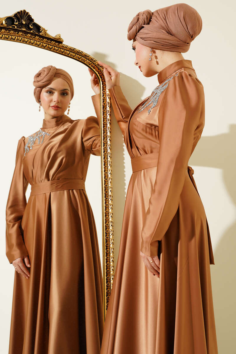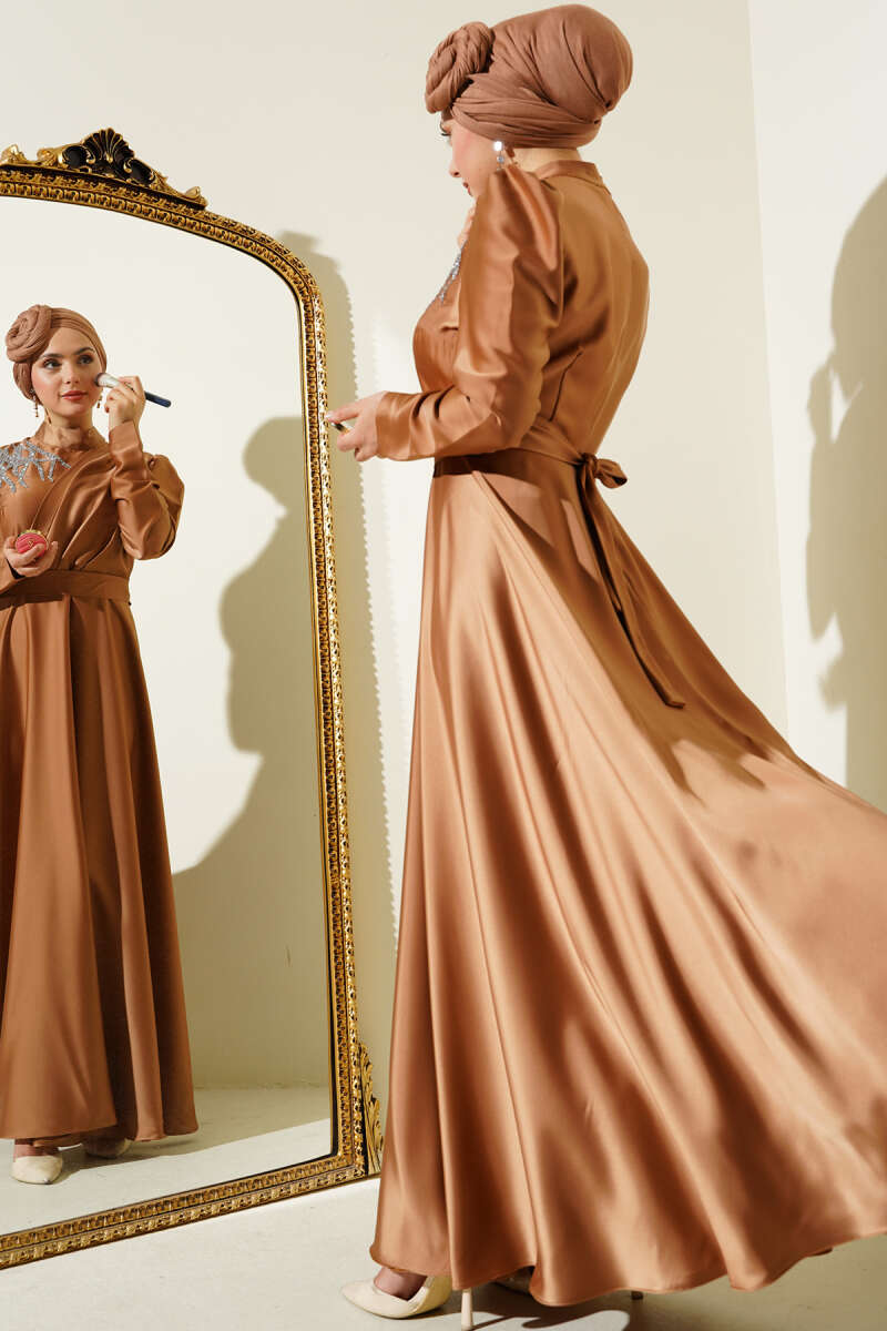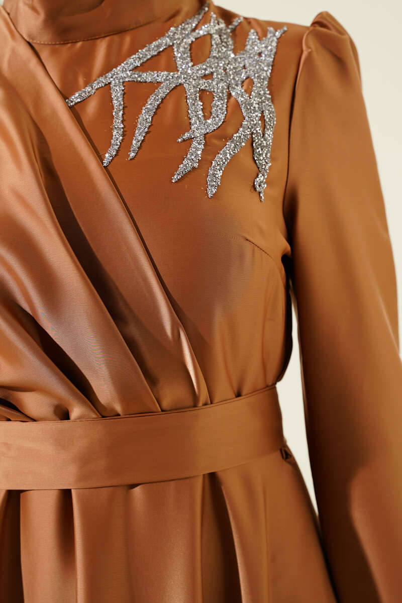 Gül Detaylı Pelerinli Abiye Elbise Pudra