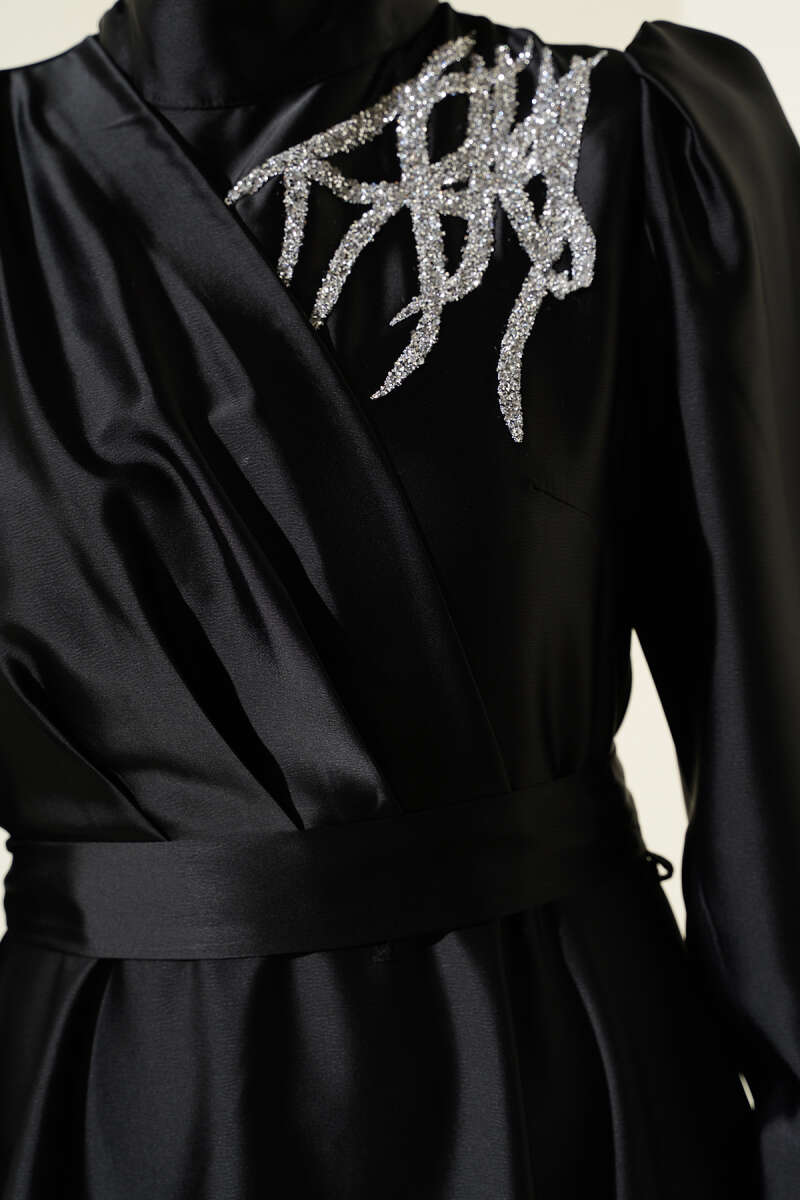 Omuz Pelerinli Taş Detaylı Abiye Elbise Siyah