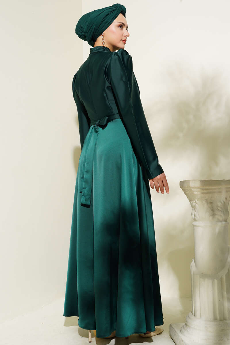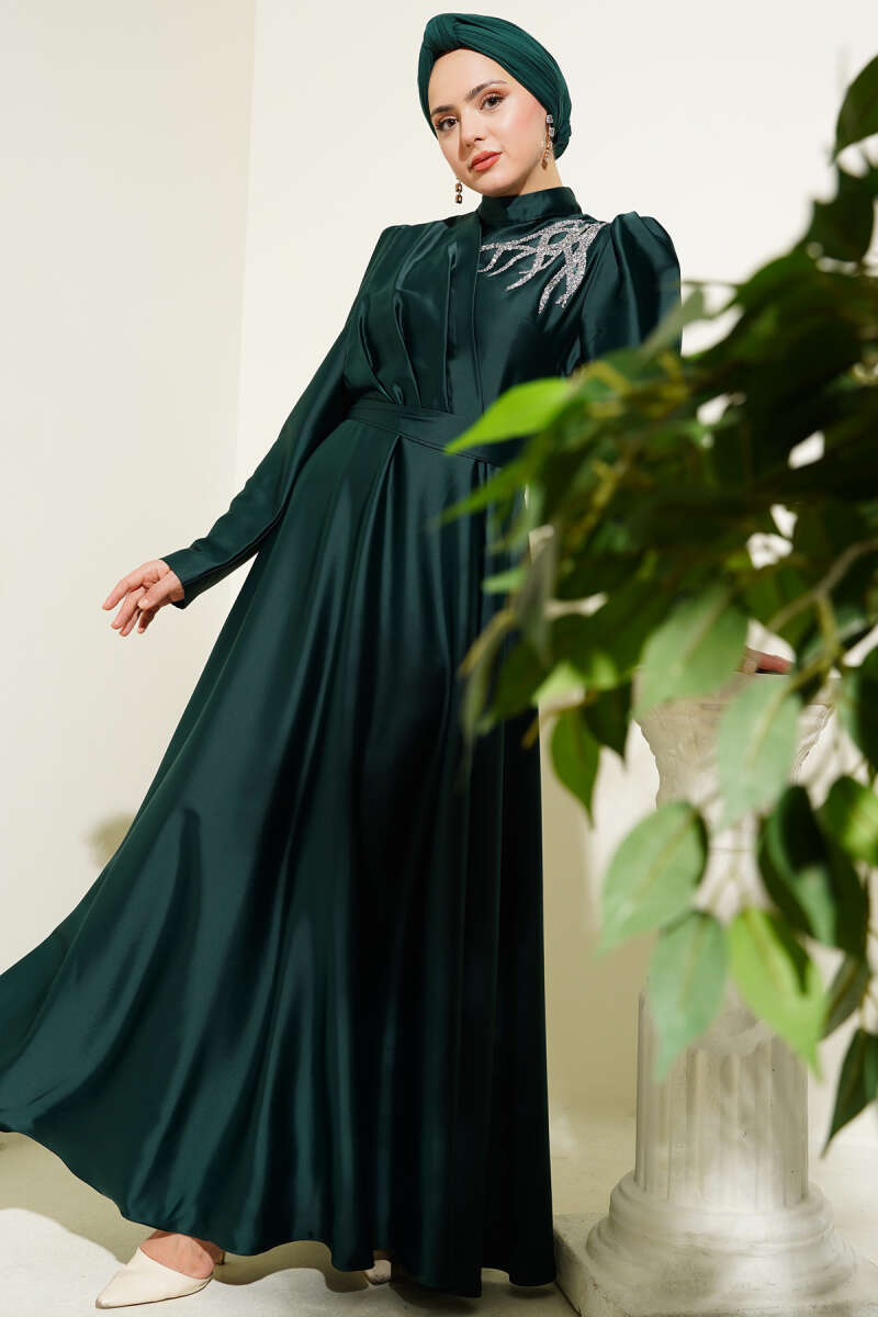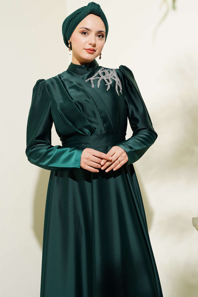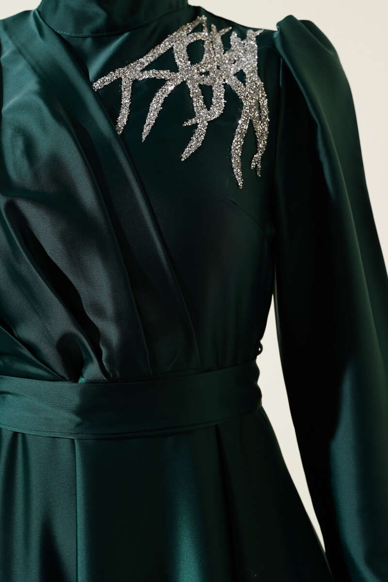 Gül Detaylı Pelerinli Abiye Elbise Haki