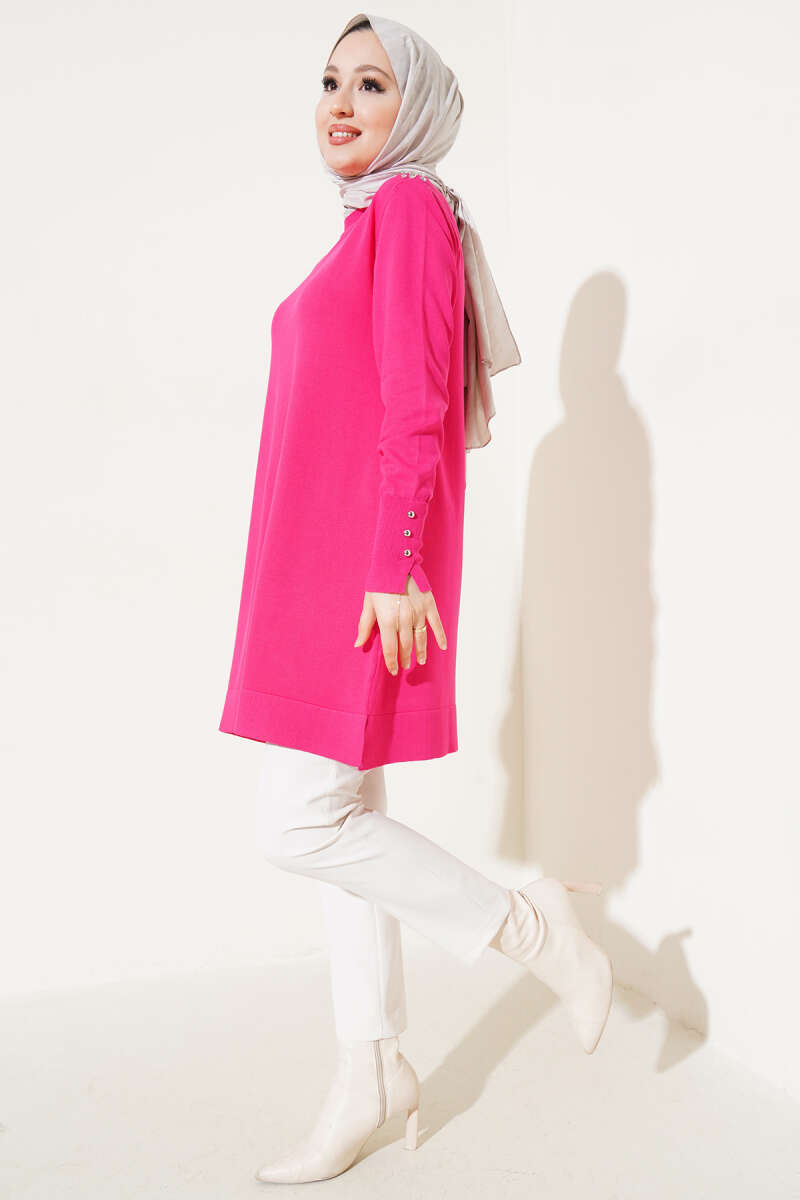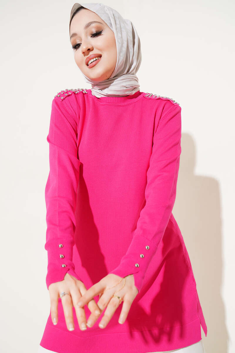Yatay Çizgili Düşük Omuz Triko Tunik Pembe