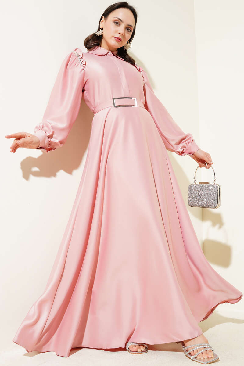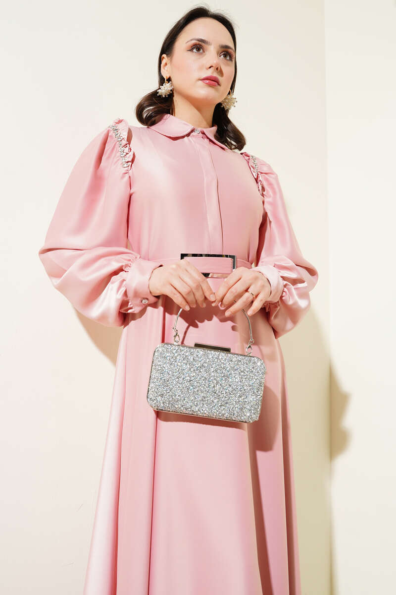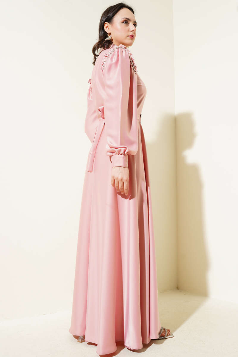 Omuz Taşlı Yarım Gizli Düğmeli Saten Elbise Pudra