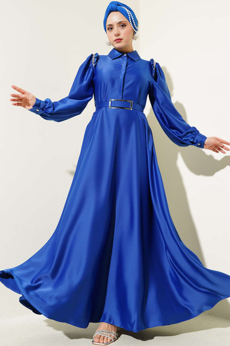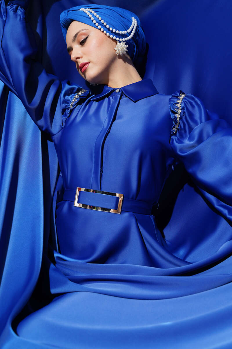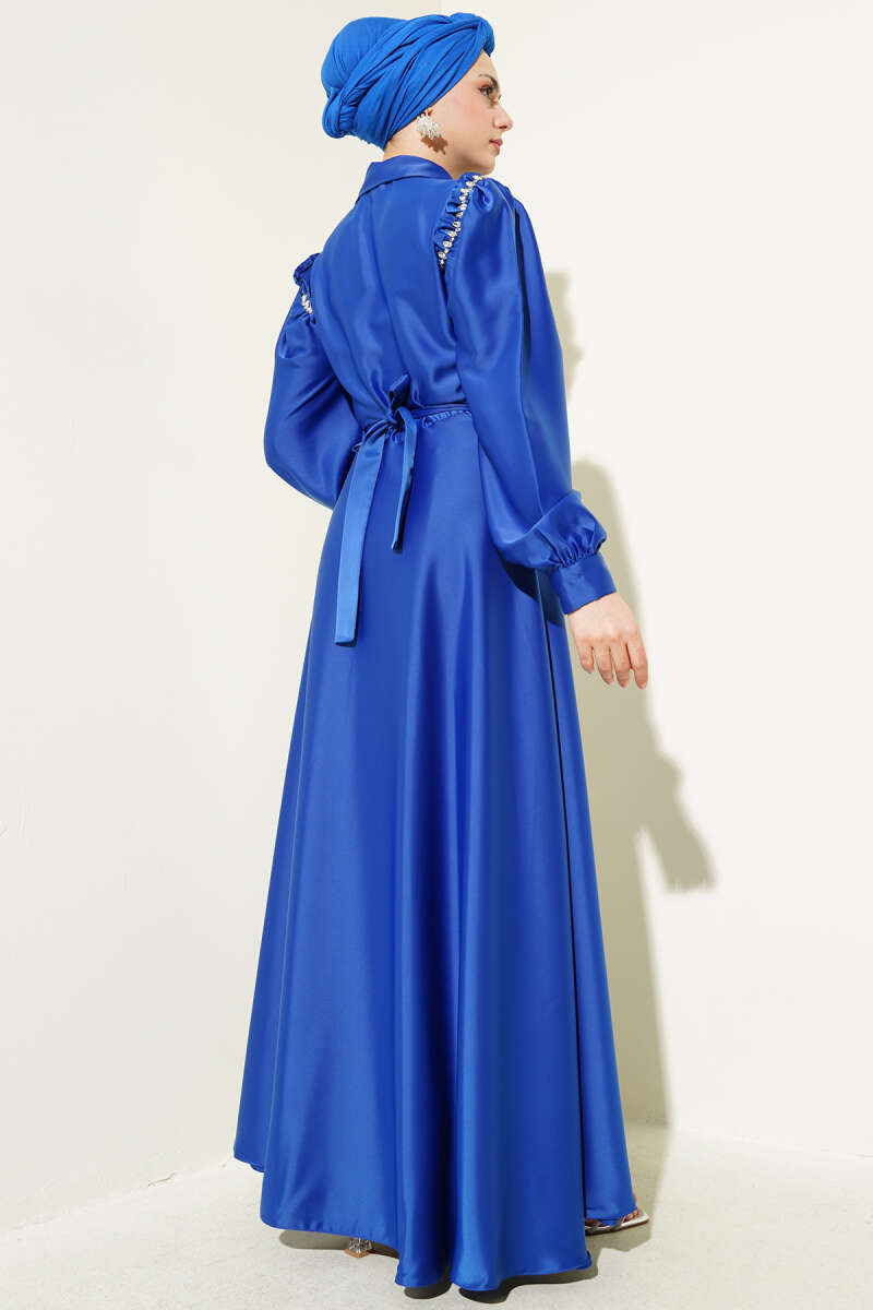 Omuz Taşlı Yarım Gizli Düğmeli Saten Elbise Saks