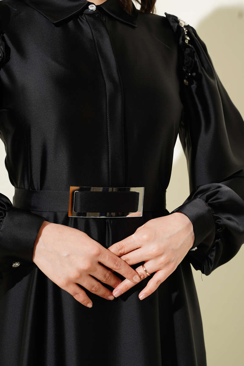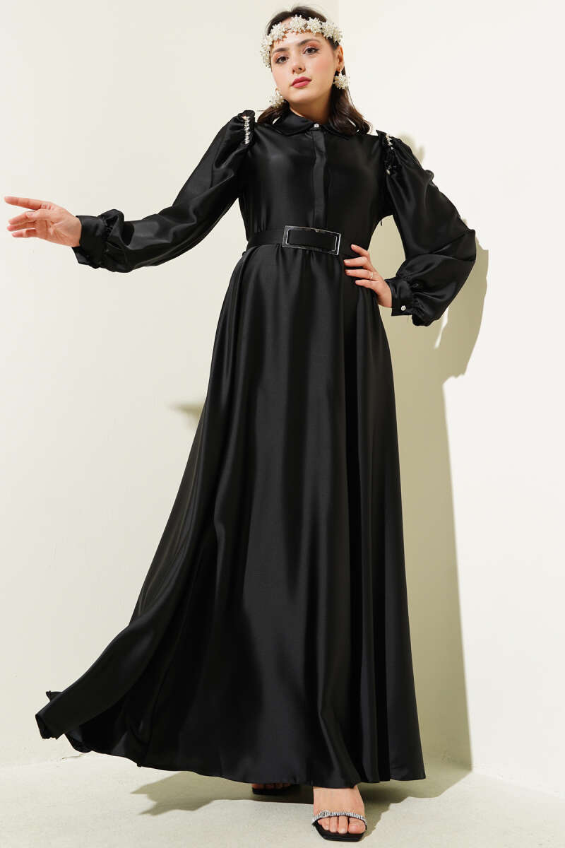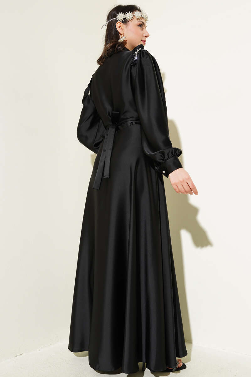 Bel Taşlı Pelerinli Abiye Elbise Siyah