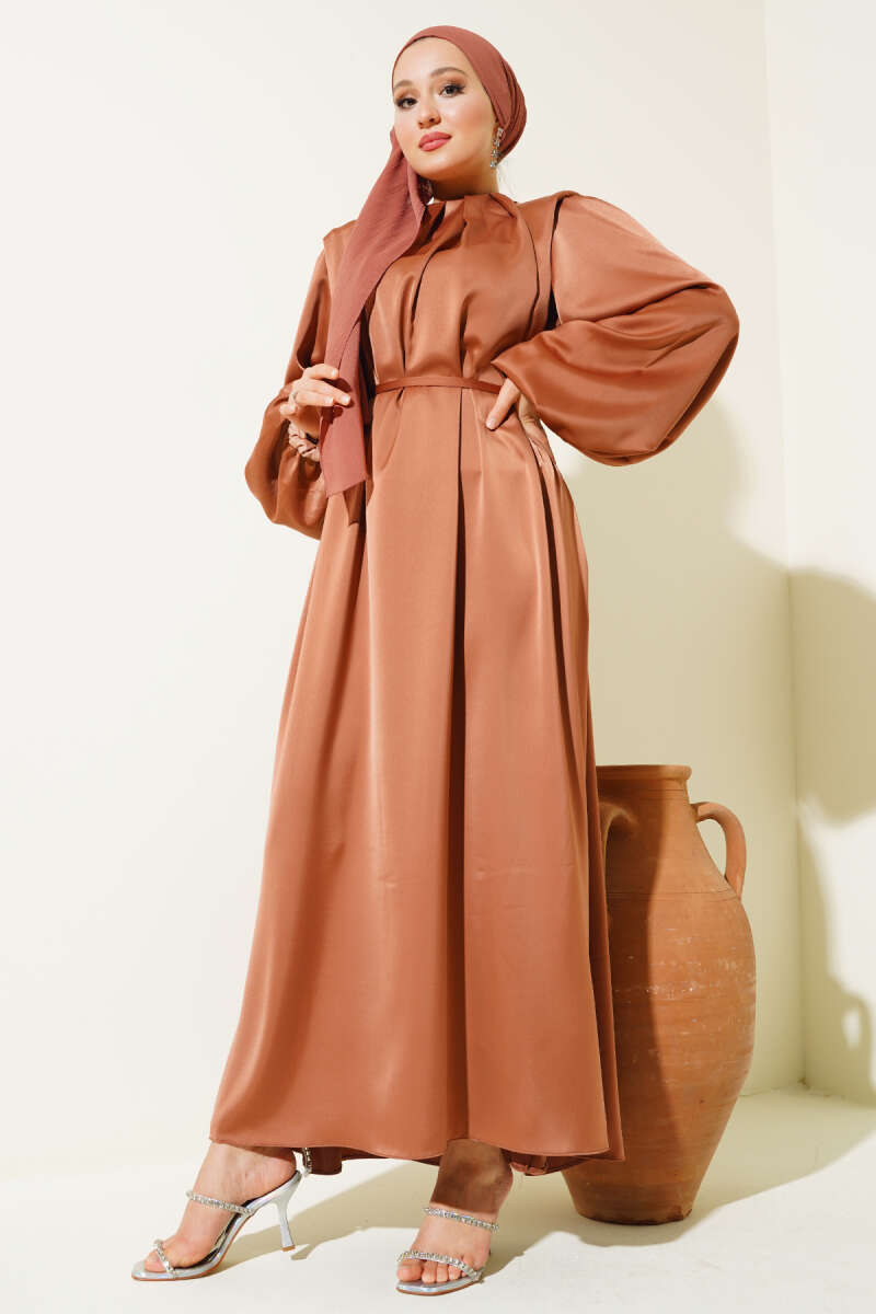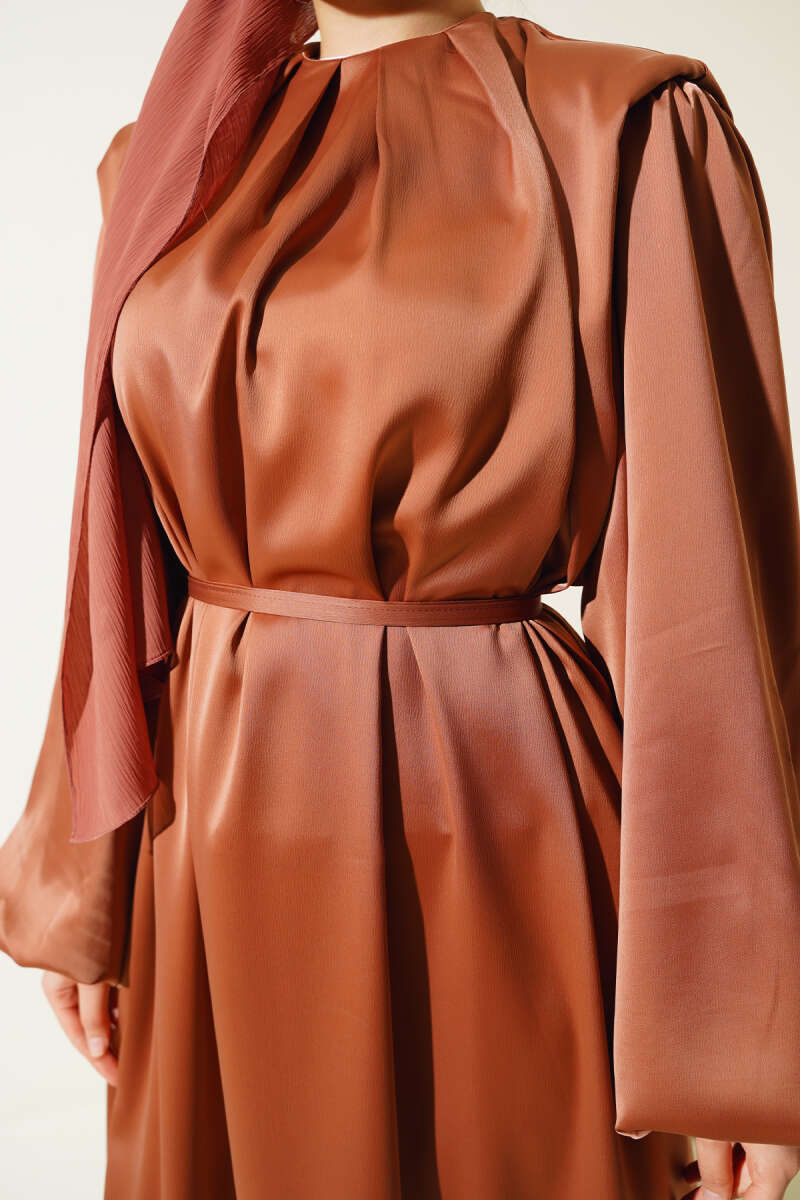 Pelerin Detaylı Pileli Triko Elbise Kahve