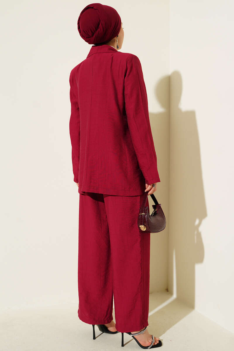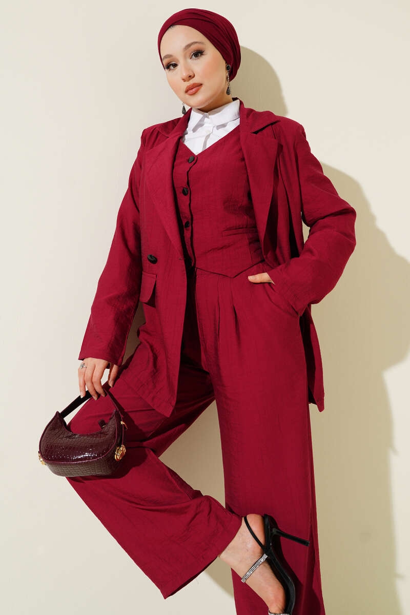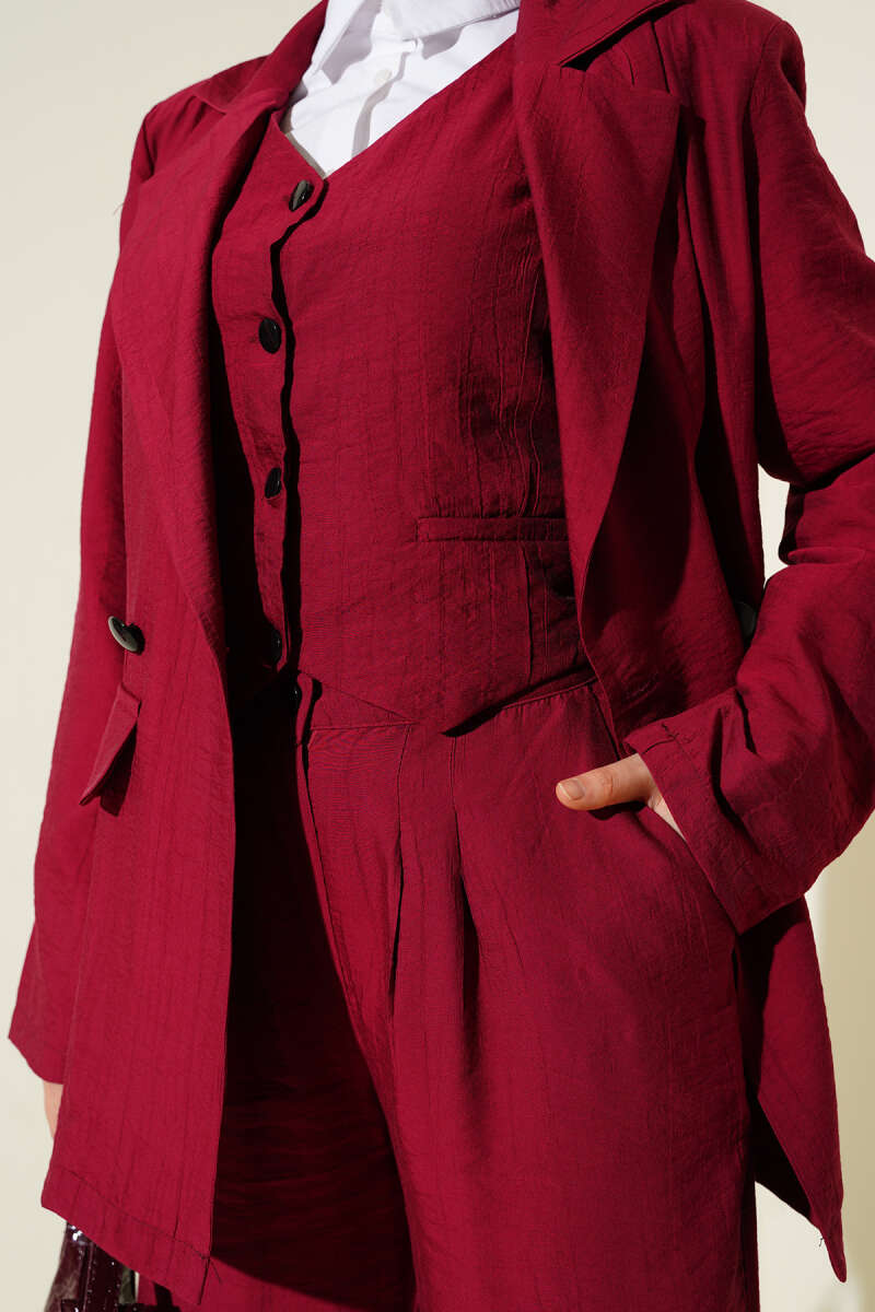 Omuz Vatkalı Ceketli Yelekli Üçlü Takım Bordo