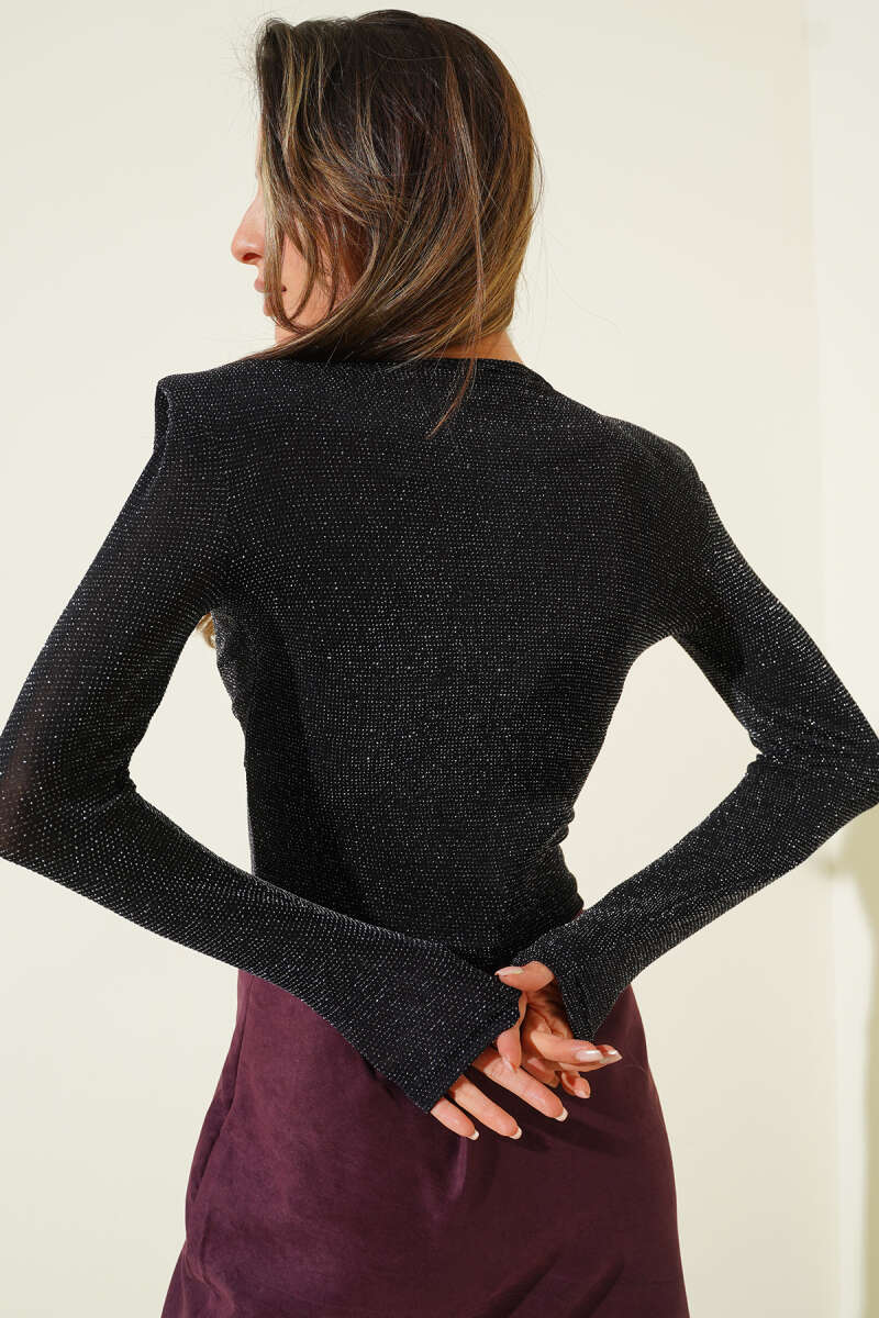 İspanyol Paça Beli Lastikli Simli Pantolon Siyah
