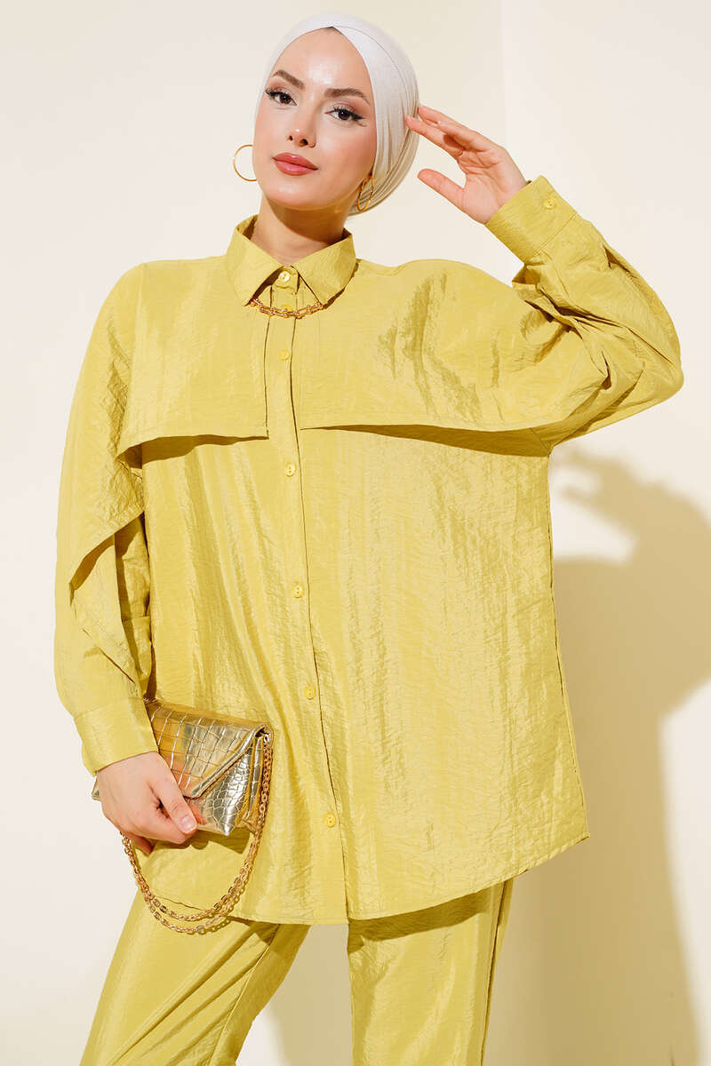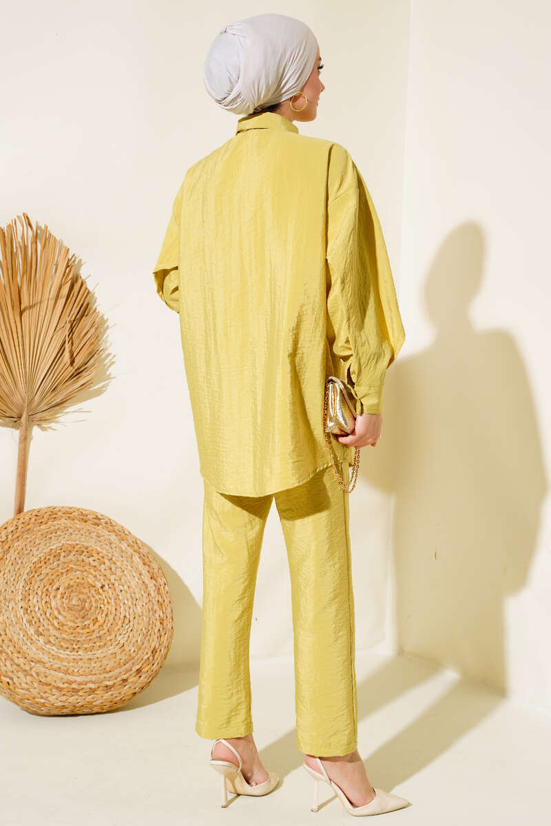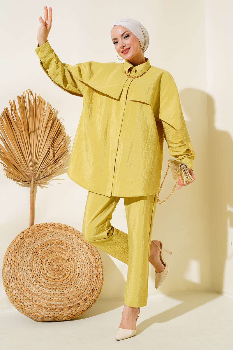 Yeni sezon ikili takımımız sizlerle beraber. Tuniğimizin önü boydan düğmelidir. Omuz ve kolu kat detaylıdır. Kol bilekleri manşetli ve düğmelidir. Gömlek yakadır. Pantolonumuzun beli lastiklidir. Cepsiz modeldir. Şık ve zarif ikili takımımız renk seçenekleriyle sizleri beklemektedir.