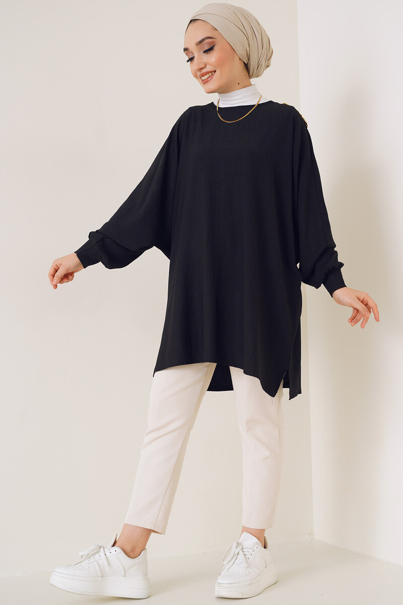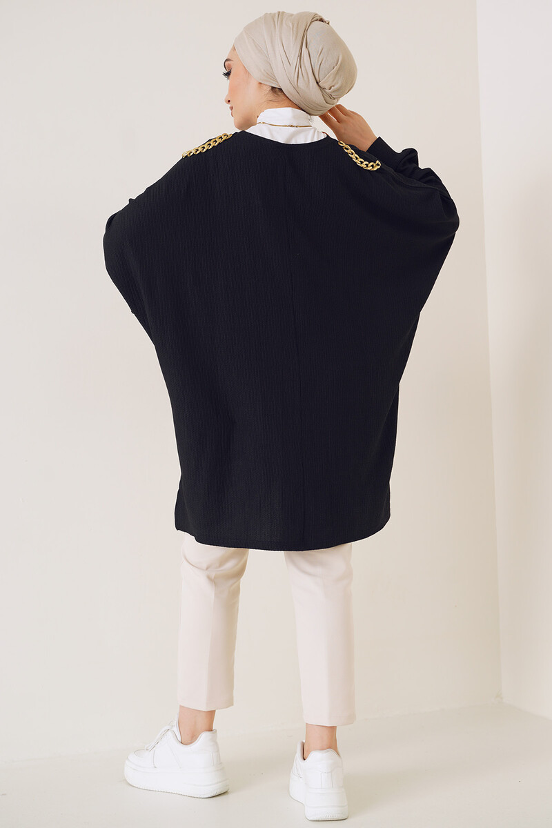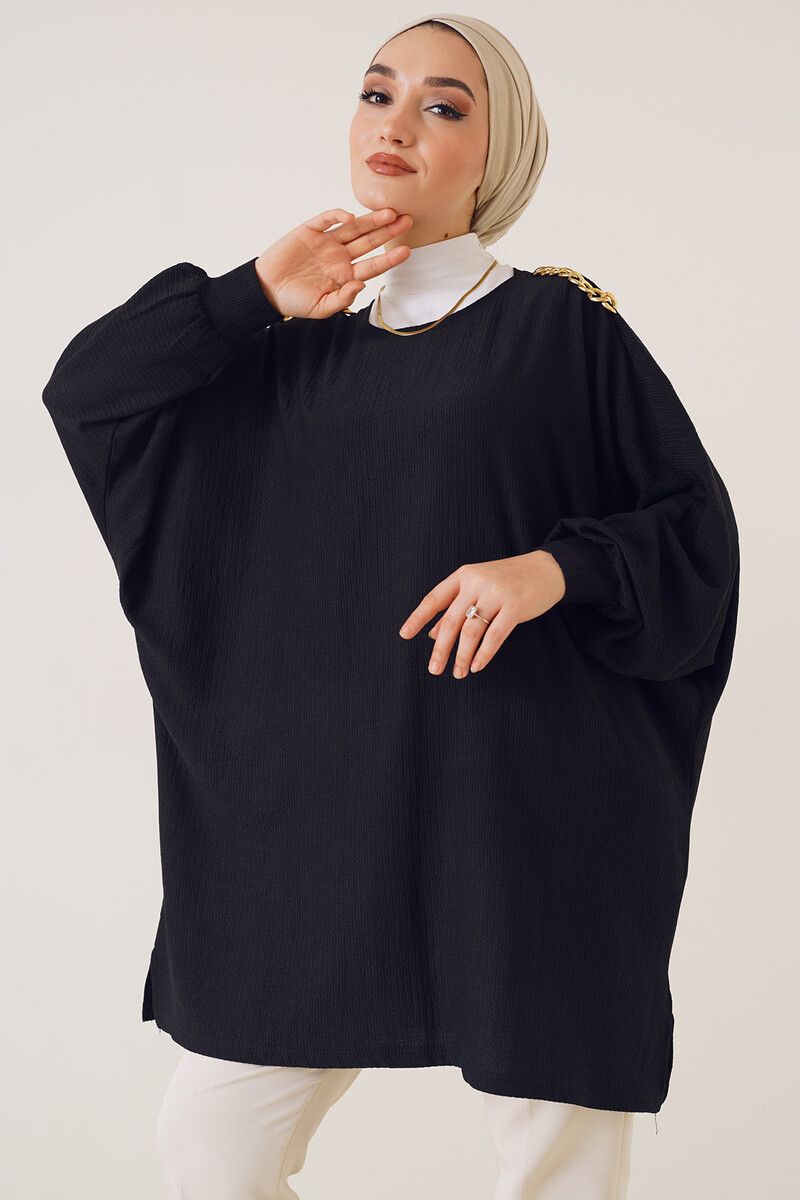 Yeni sezon tuniğimiz harika tasarımıyla sizler için geldi. Tuniğimizin omuzlarında zincir detayları bulunmaktadır. Kolları yarasa tasarımdır. Oversize yapıdadır. Salaştır. Bürümcük kumaştan yapılmıştır. Her kıyafetinizle rahatlıkla kombin yapabilirsiniz.
