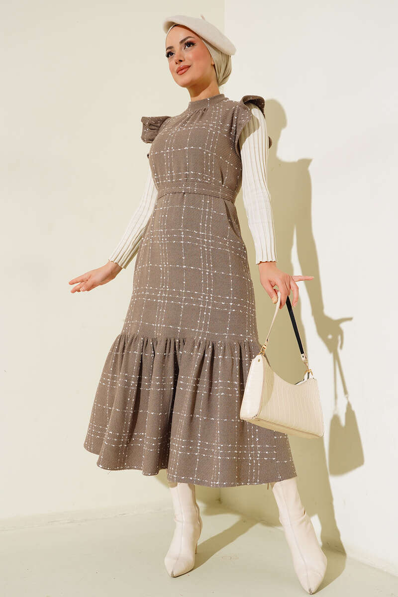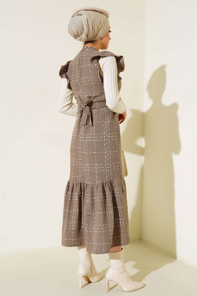 Yeni sezon jile elbisemiz aradığın tamamlayıcı parça olarak özel seçildi. Omuzları fırfırlı olan jile elbisemizin sırt fermuarı bulunmaktadır. Hakim yaka elbisemiz bel kuşaklıdır.