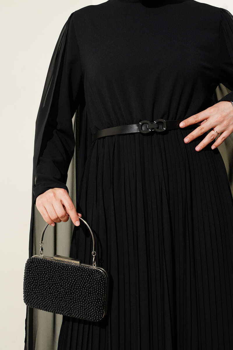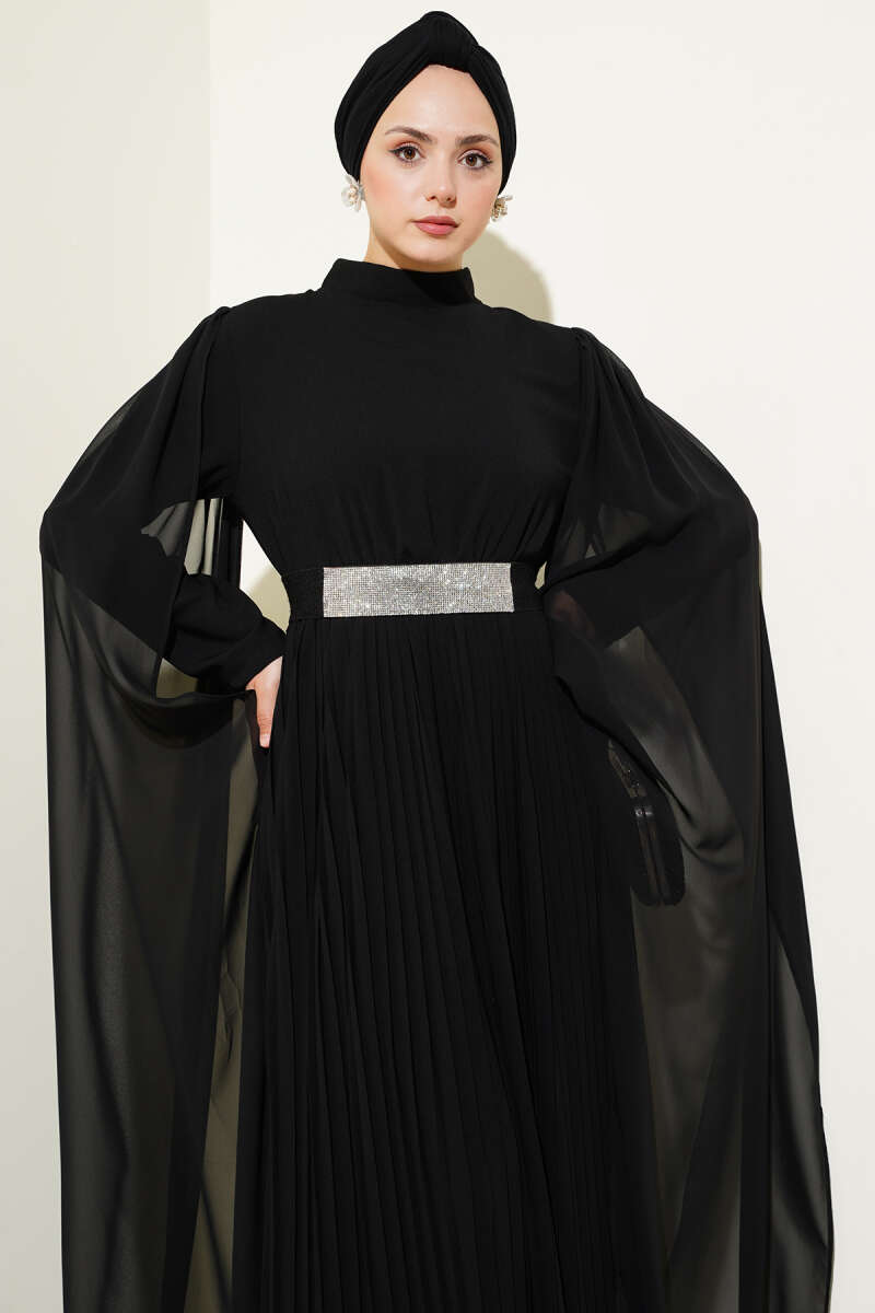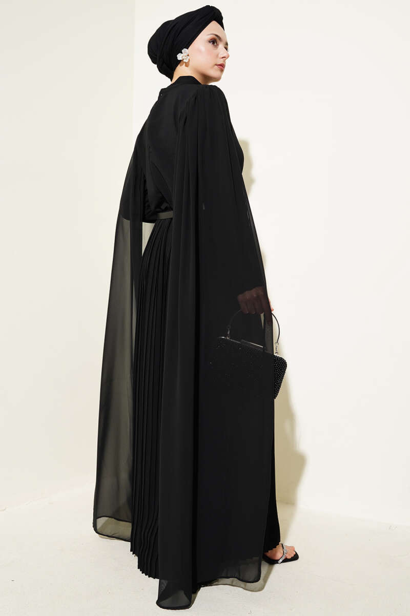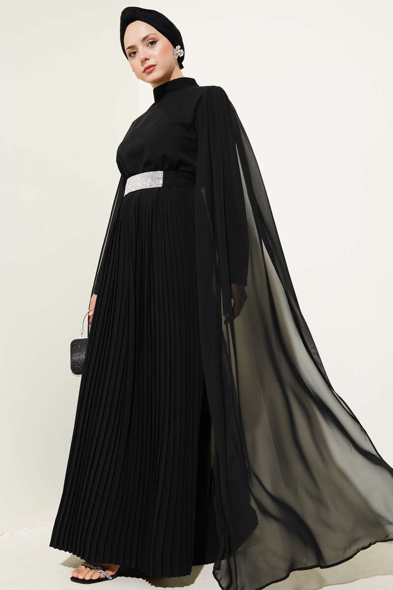 Bel Taşlı Pelerinli Abiye Elbise Siyah