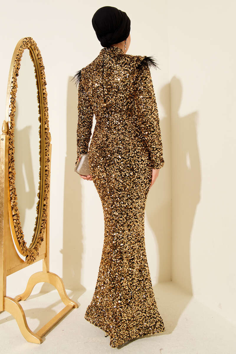 Omuzları Tüylü Pul Payet Abiye Elbise Siyah Gold
