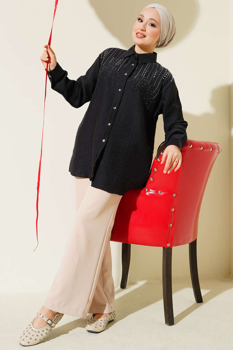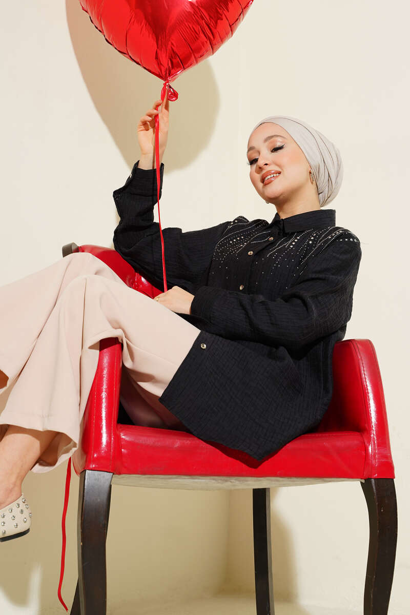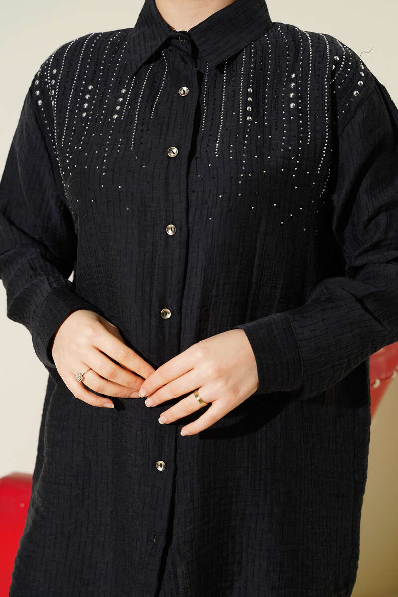 Ekose Desen Taşlı Gömlek Siyah
