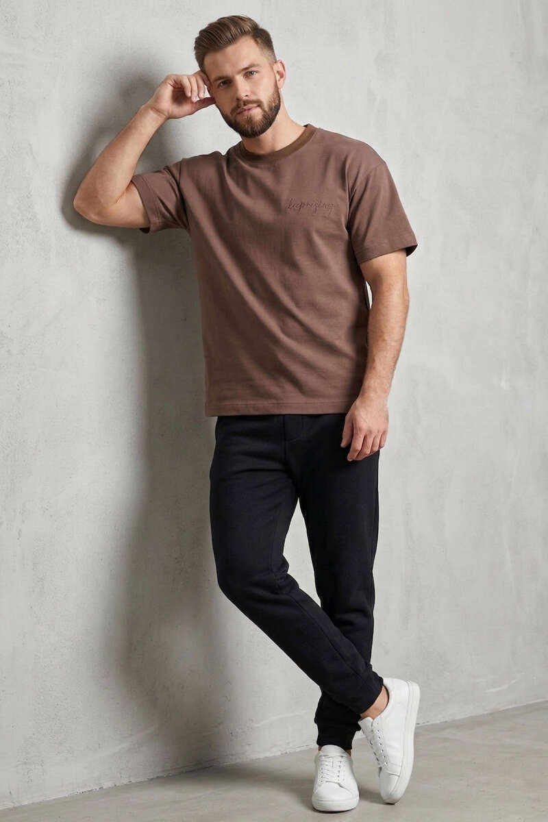 Ön Ve Arka Nakışlı Oversize Erkek T-shirt Vizon