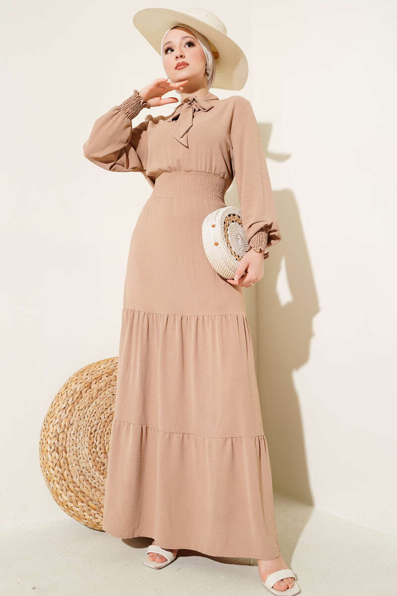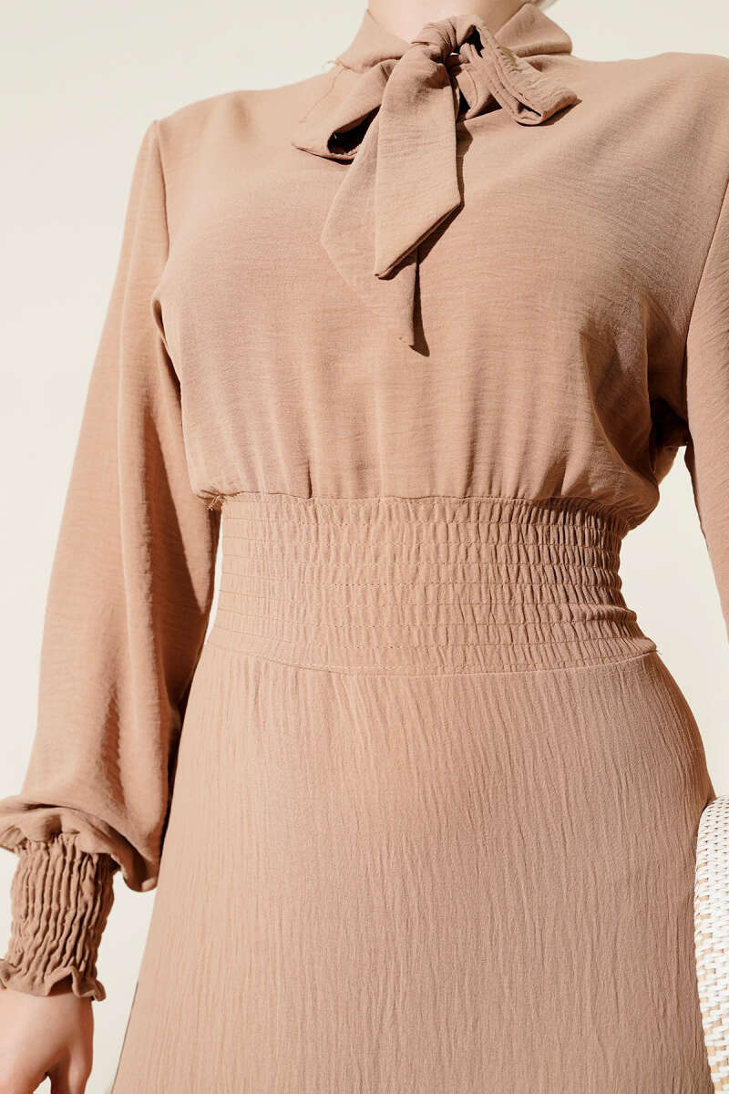 Kuşaklı Dik Fitilli Kaşe Elbise Latte