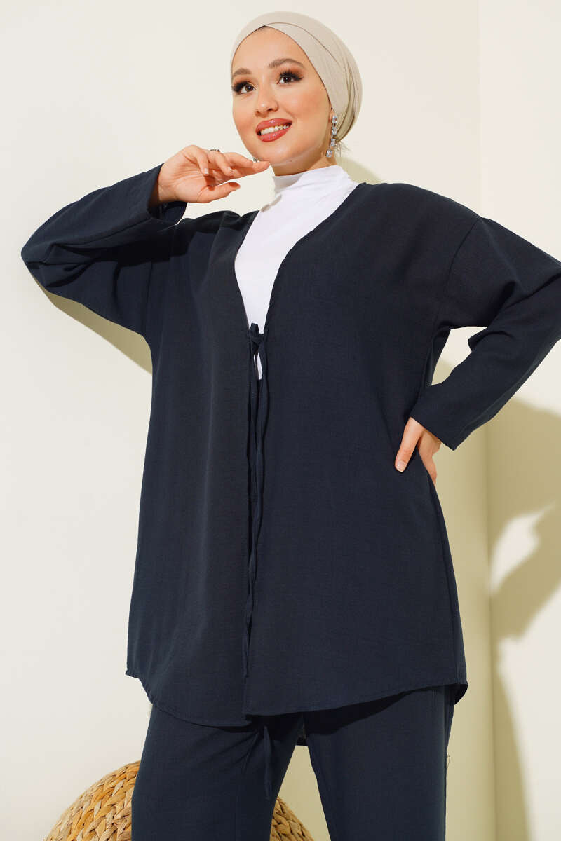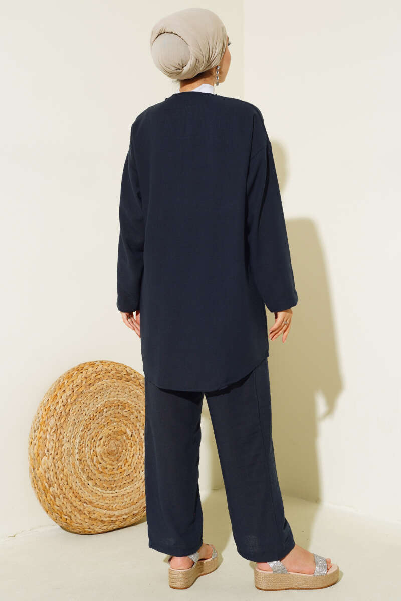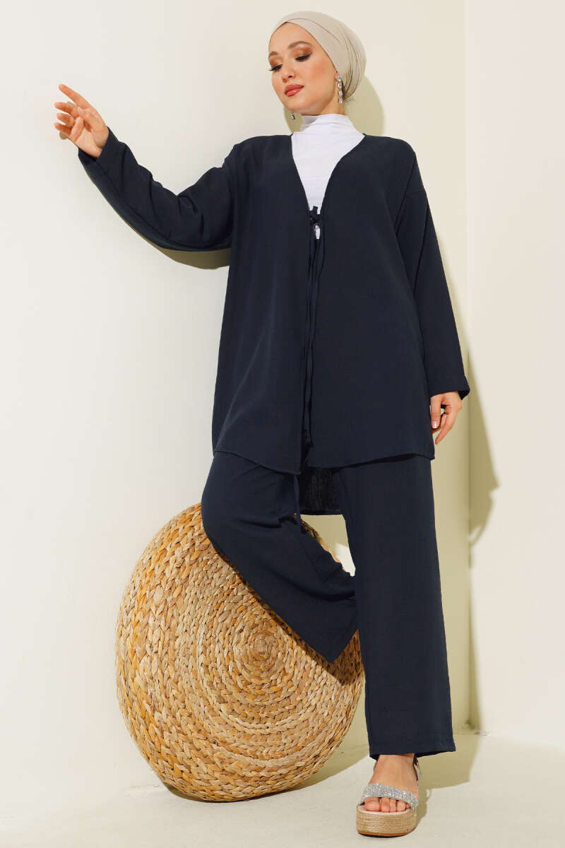 Gömlek Garnili Kuşaklı Çizgili Takım Lacivert