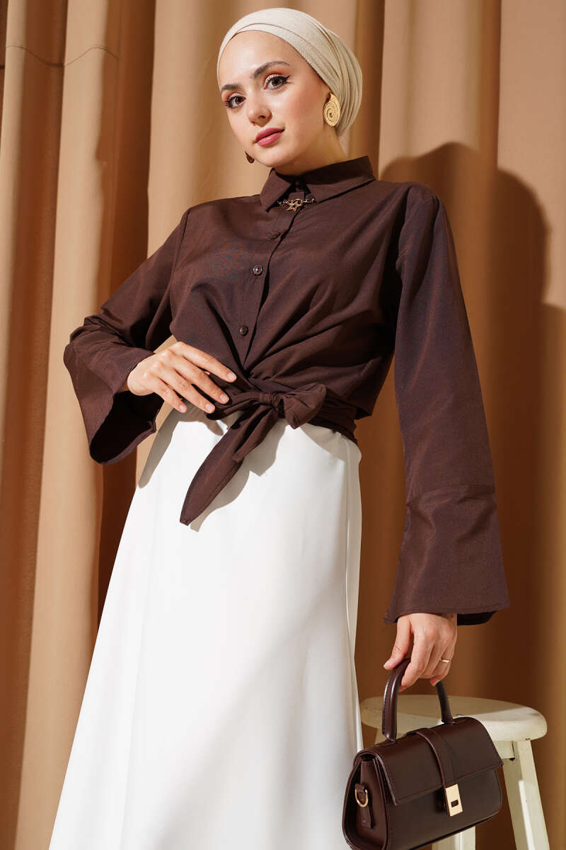 Gizli Düğmeli Bel Kuşaklı Gömlek Bordo
