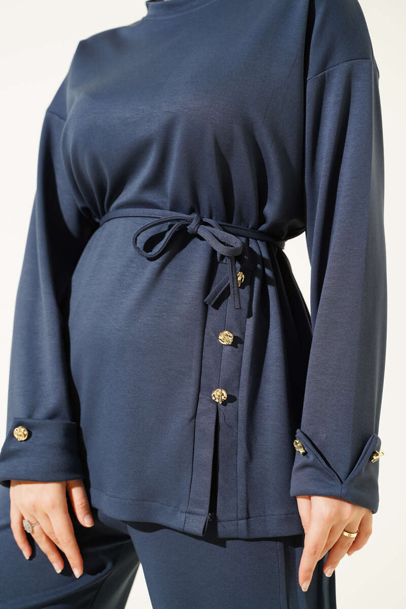 Önden Düğme Detaylı İp Bağcıklı İkili Takım Lacivert