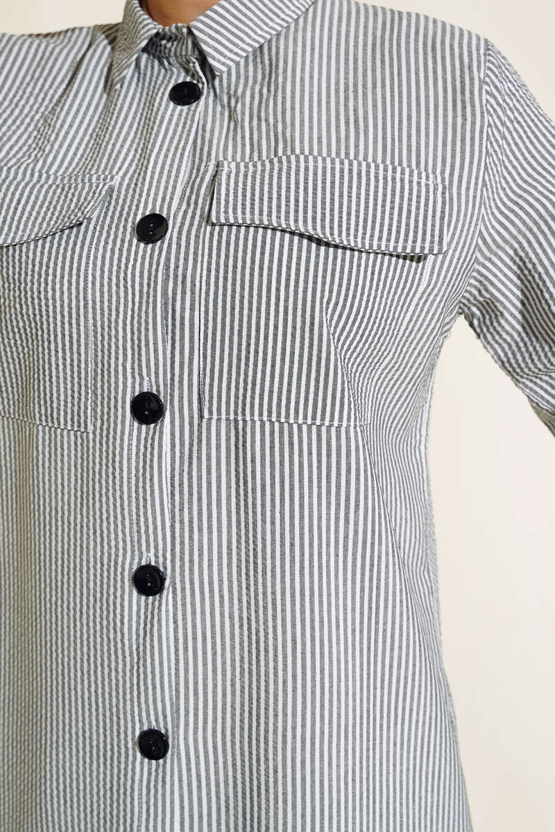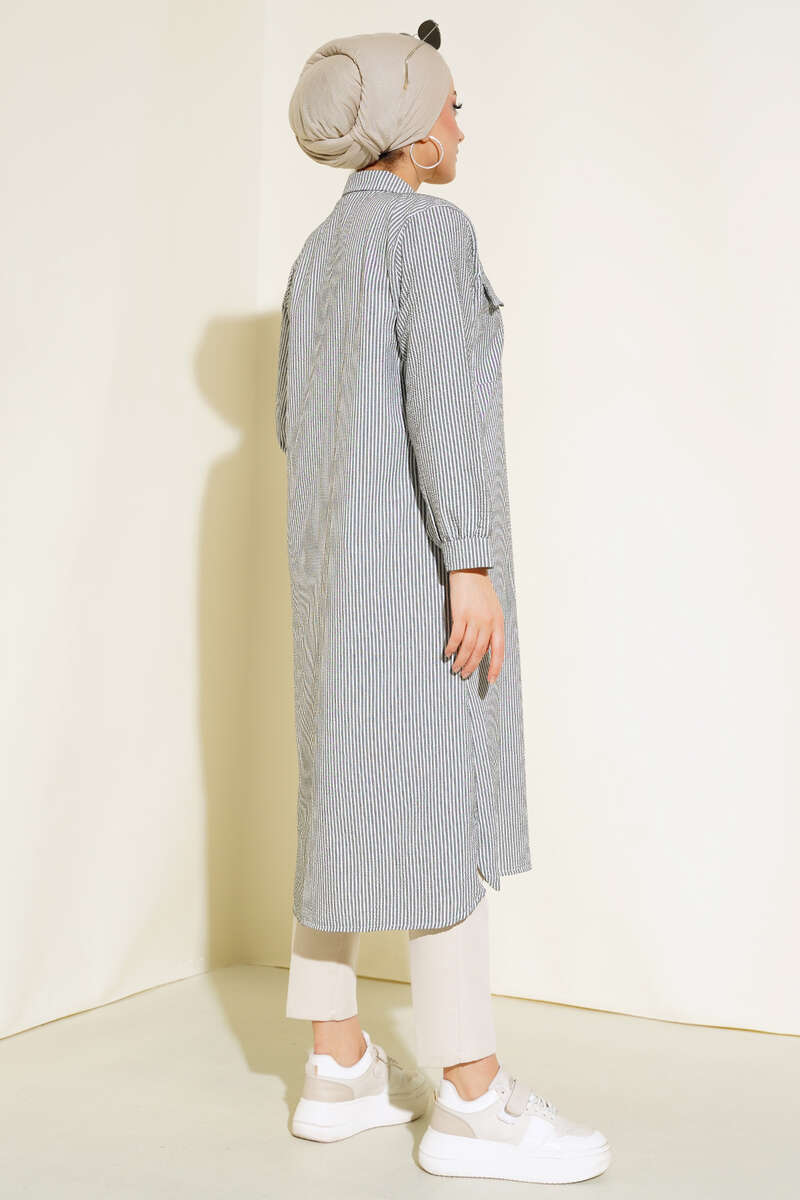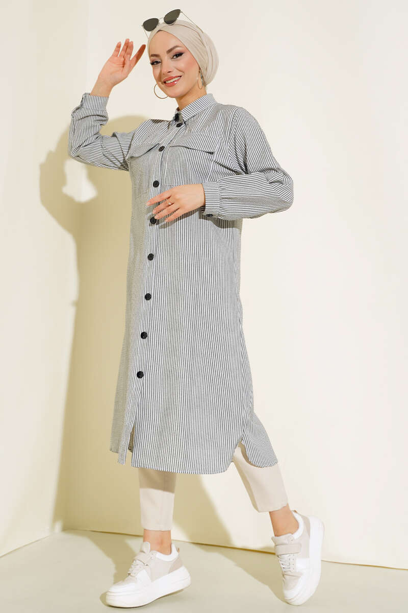 Yeni sezon tunik modelimiz sizlerle beraber. Önü boydan düğmelidir. İki adet kapaklı kapaklı cebi bulunmaktadır. Etek ucu yanlardan yırtmaçlıdır. Gofre gömlek modelimiz çizgili modeldir.